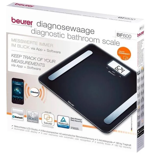 Інноваційні підлогові ваги Beurer BF 600 Pure Black з бездротовим під'єднанням до смартфона або планшета. Завдяки технології Bluetooth low energy результати вимірювань і дані про ваші фізичні показники завжди з вами — вдома, у дорозі, у подорожах. Для оптимального контролю ваги завантажте програму Beurer HealthManager через App Store або Google Play. Підлогові діагностичні ваги, крім простого зважування, дають змогу визначити частку жирової маси, тканинної рідини, м'язової та кісткової маси, рівень основного й активного обміну речовин, індекс маси тіла.