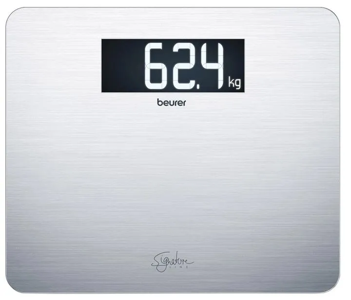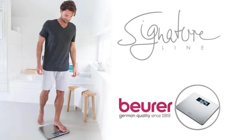 Ваги з покриттям із неіржавкої сталі Beurer GS 405 Signature Line — дизайн і функціональність в одному пристрої! Точні дизайнерські ваги не тільки покажуть результати зважування, а й ідеально впишеться в інтер'єр вашого будинку як декоративний елемент. Велика платформа з міцного скла завтовшки 8 мм зі спеціальним покриттям від відбитків пальців (аnti-fingerprint) з неіржавкої сталі — комфортне й безпечне використання. Цифри збільшення розміру  зі спеціально розробленим РК-шрифтом на сучасному чорному дисплеї у форматі XXL з підсвіткою.