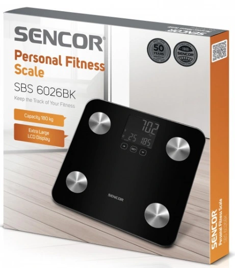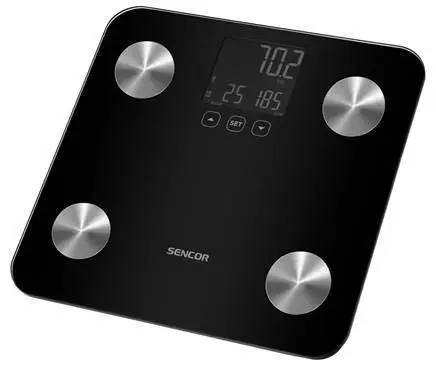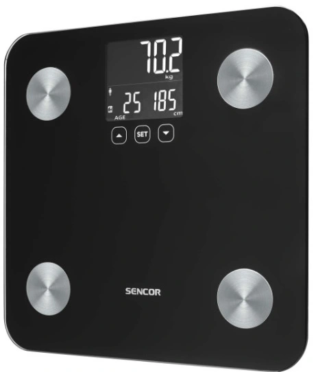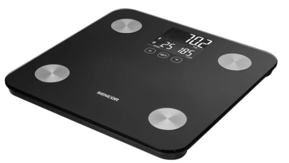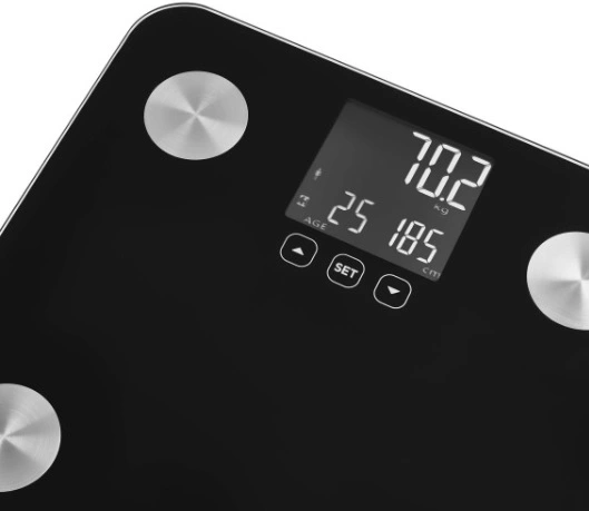 Персональні фітнес ваги. Ваги вимірюють не тільки вагу, але й параметри тіла та аналізують їх. Ваги також легко контролювати за допомогою сенсорних кнопок і легкого для читання дисплея з підсвічуванням. Ваги також привернуть увагу завдяки дизайну зі скляною платформою для зважування. Це робить ваги ідеальними для будь-якої кімнати, їх легко чистити та обслуговувати. Має великий РК-дисплей з підсвічуванням. Поєднання скла та поверхні з нержавіючої сталі для легкого обслуговування.