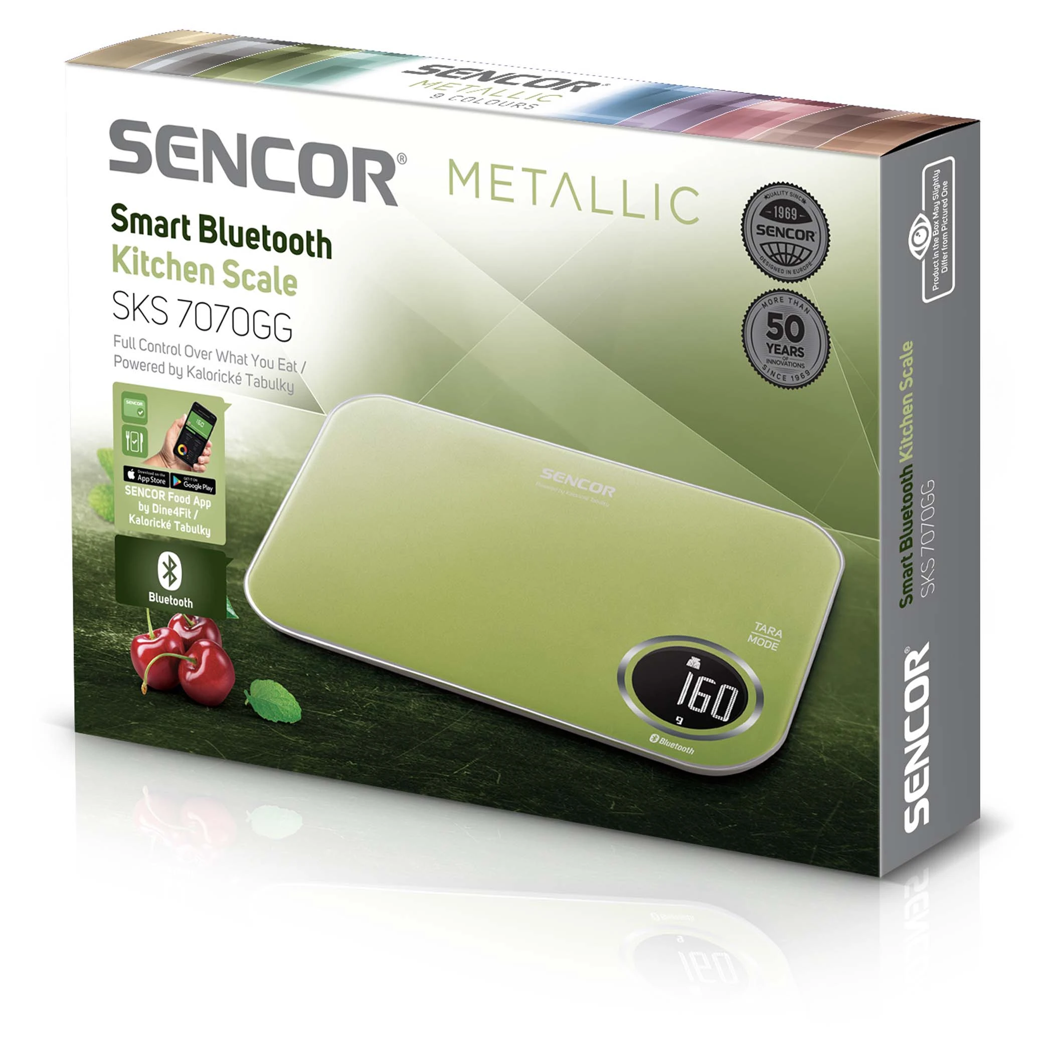 Розумні кухонні ваги Sencor SKS7070GG допоможуть вам вести ідеальний облік споживання калорій та окремих поживних компонентів. Він пов’язаний з найкращою доступною базою даних про продукти харчування, оскільки контрольний додаток Sencor FOOD був розроблений у співпраці з авторами популярного додатку Dine4Fit.