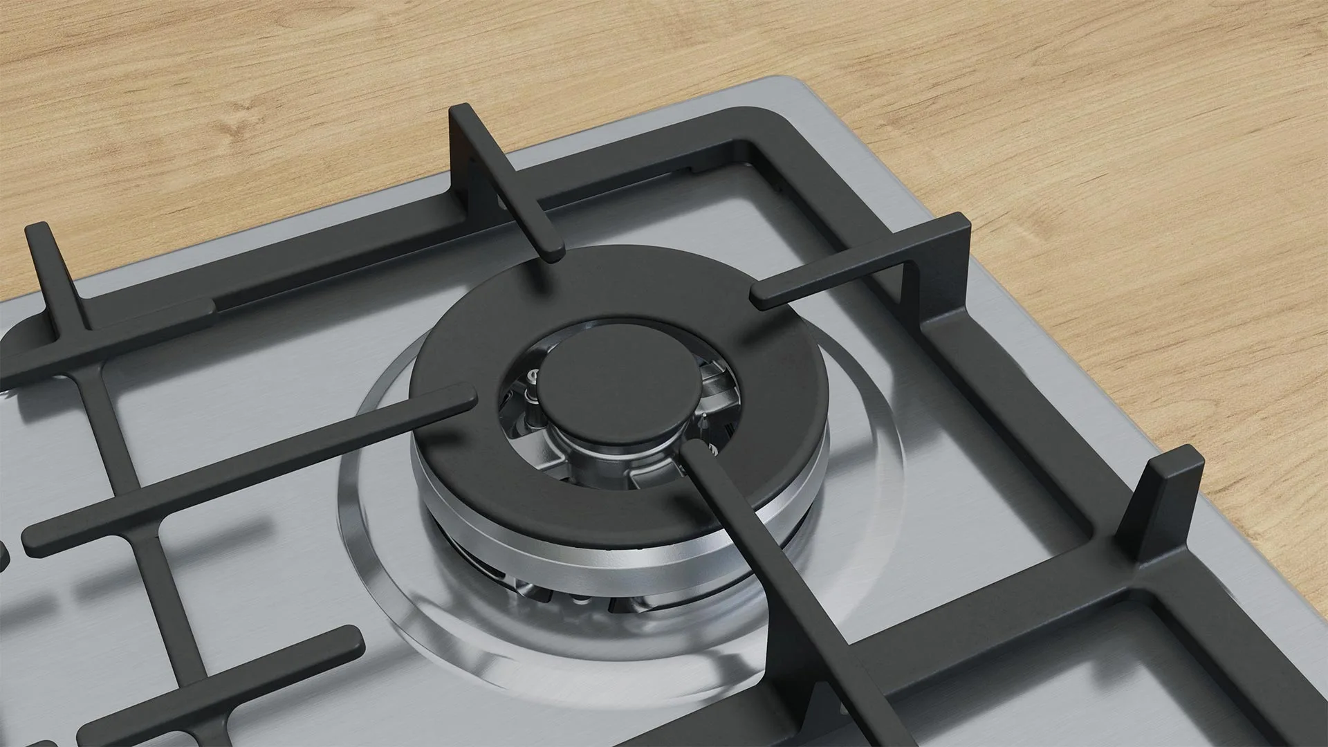 Bosch PGH6B5K90R – це високоякісна газова варильна поверхня, яка поєднує функціональність, безпеку та сучасний дизайн. Виготовлена з нержавіючої сталі, вона є стійкою до подряпин, корозії та легка в догляді. Чавунні решітки забезпечують міцність і стабільність, а WOK-конфорка з потужністю 3.3 кВт дозволяє готувати страви на високих температурах. Автоматичний електрозапал у ручках робить використання зручним, а система газ-контролю забезпечує максимальну безпеку.
