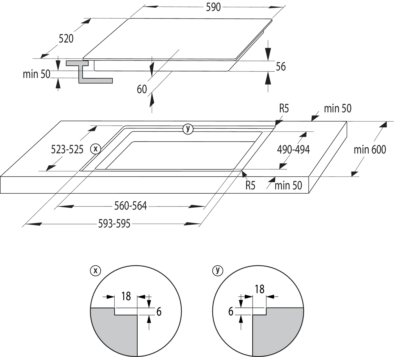 - Размеры для встраивания 56-56,4 × 5 × 49