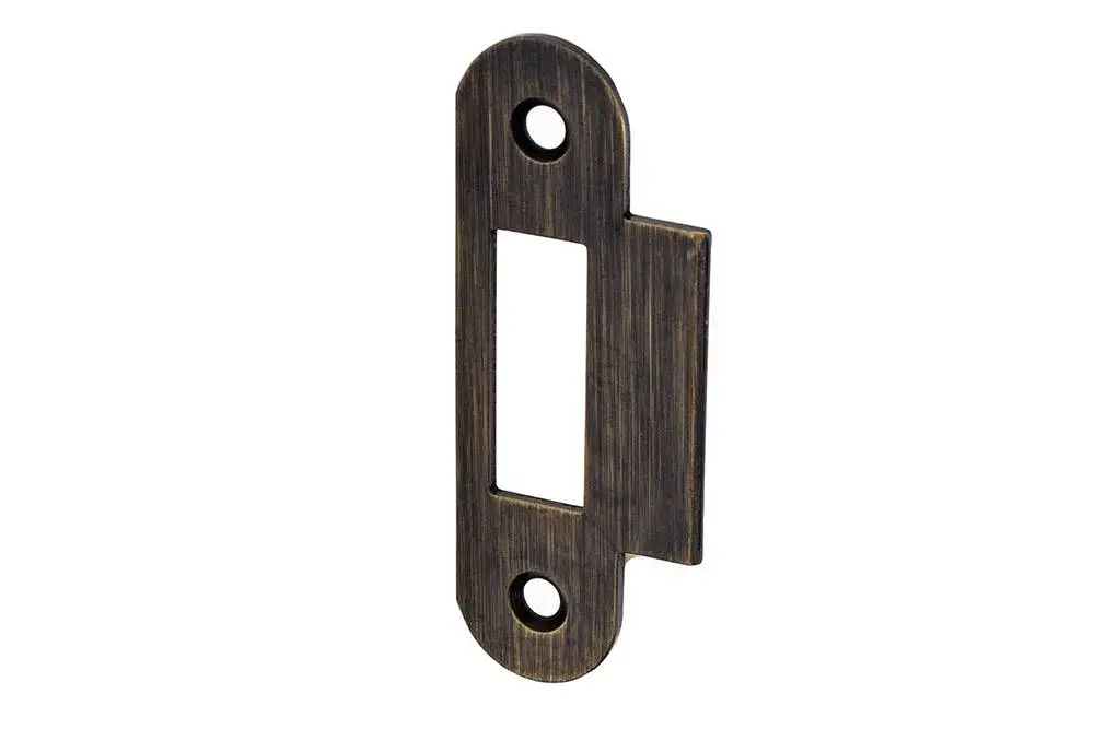 Планка замка, з виступом. Універсальна, права чи ліва по DIN. Матеріал: сталь. Покриття / колір: стара бронза. Розміри планки замка: Висота: 82 мм. Ширина: 22 мм. Товщина: 2 мм. Виступ: 12 мм. Розмір отвору під ригель замка: 12 х 34 мм.