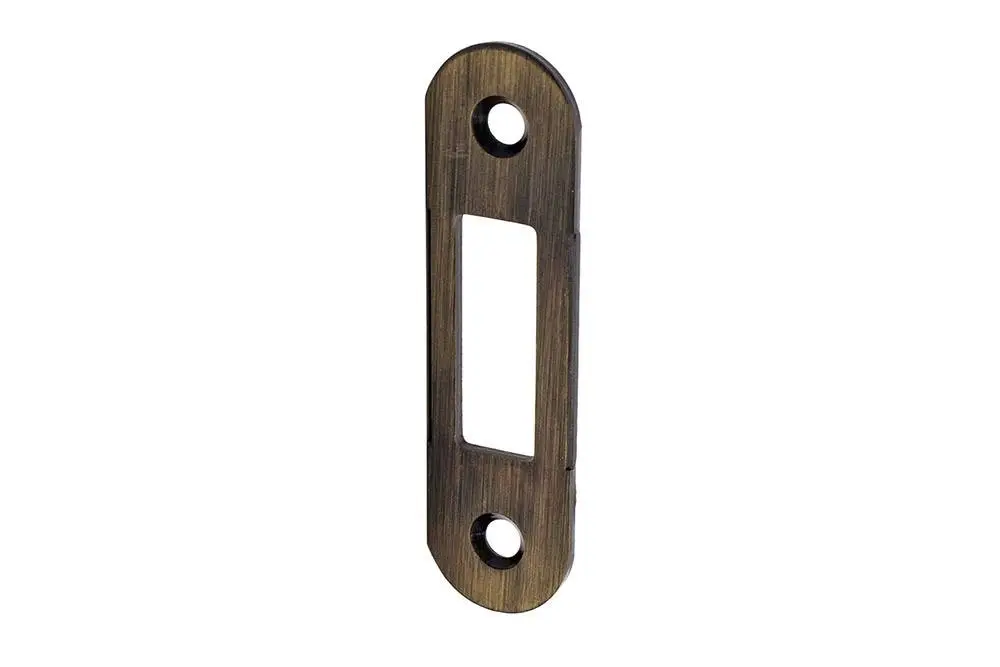 Планка дверного замка. Універсальна, права чи ліва по DIN. Матеріал: сталь. Покриття / колір: бронза стара. Розміри планки замка: Висота: 82 мм. Ширина: 22 мм. Товщина: 2,5 мм. Розмір отвору під ригель замка: 12 х 34 мм.