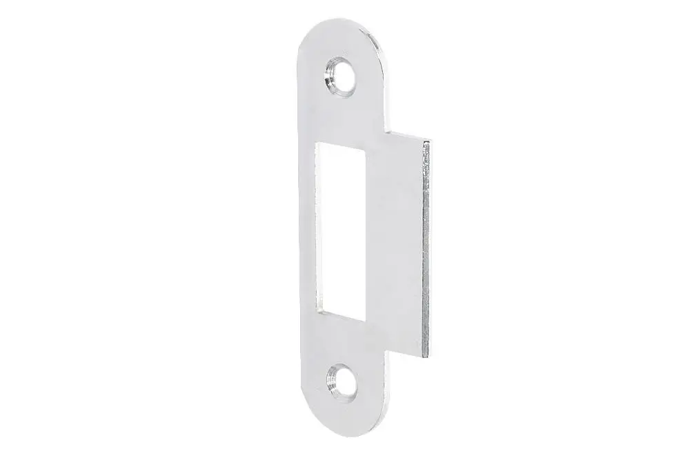 Планка замка, з виступом. Універсальна, права чи ліва по DIN. Матеріал: сталь. Покриття / колір: хромована полірована. Розміри планки замка: Висота: 82 мм. Ширина: 22 мм. Товщина: 2 мм. Виступ: 12 мм. Розмір отвору під ригель замка: 12 х 34 мм.
