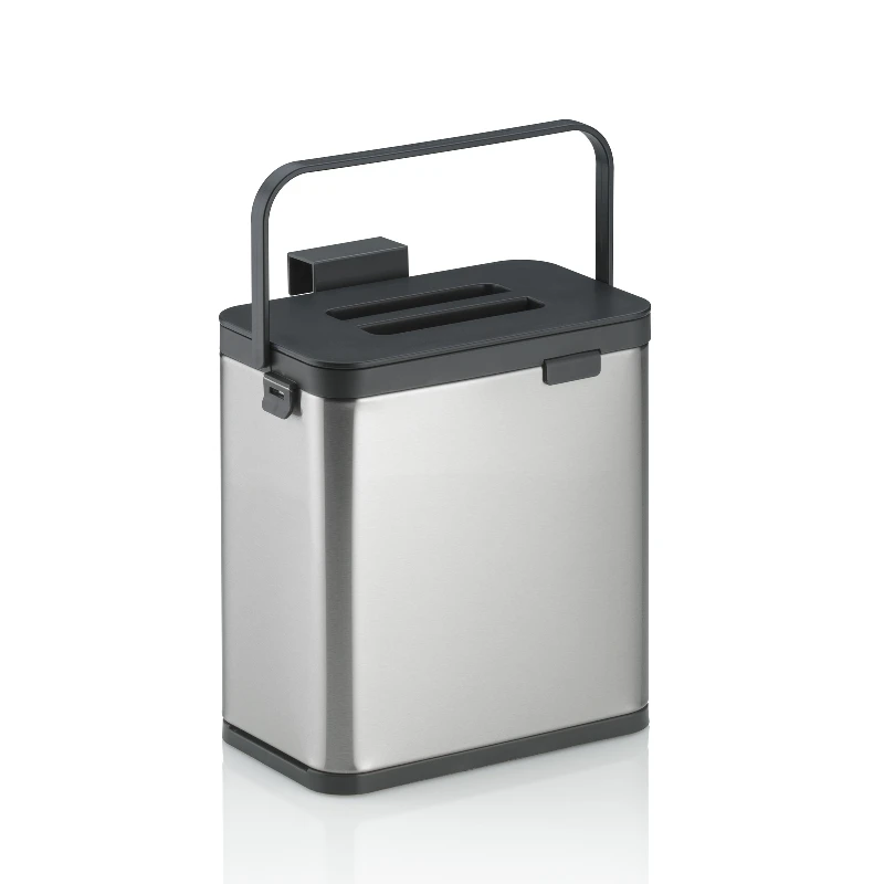 Відро для органічних відходів KELA Plata з нержавіючої сталі з внутрішнім контейнером із чорного пластику вражає своєю продуманою конструкцією та функціональністю.