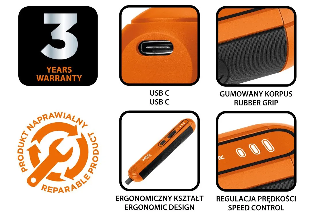 Акумуляторний шуруповерт 4 В, 04-199 від NEO TOOLS - це зручний пристрій, який буде незамінним у професії електрика, слюсаря, а також у завданнях домашнього майстра або механіка. Інструмент характеризується напругою 4 вольти і ємністю акумулятора 1 500 мАг. Заряджається через USB-C (без зарядного пристрою) і забезпечує до 55 хвилин роботи від повного заряду акумулятора. Завдяки робочому патрону HEX ¼" він сумісний з багатьма аксесуарами. У комплект входять насадки для викруток 25 мм (25 штук: SL3, SL4, SL5, SL6, PZ1, PZ2, PZ3, T10, T15, T20, T25, T30, PH1, PH2, PH3, H2, H3, H4, H5, H6), адаптер 60 мм і зарядний кабель.