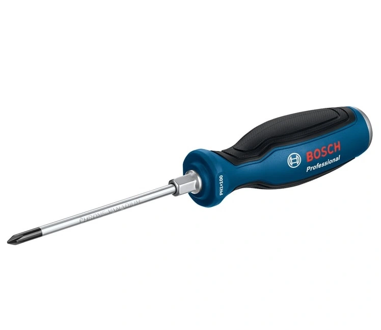 Професійна хрестоподібна викрутка Bosch PH1 надзвичайно міцна завдяки суцільному металевому стрижню, який також проходить через ручку, металевим ударним наконечникам і загартованому наконечнику. Ергономічна форма та м'яка поверхня рукоятки забезпечують комфорт, а вбудований шестигранне гніздо дає змогу застосовувати додатковий крутний момент. Підходить для загвинчування, довбання та відкручування тугих гвинтів.