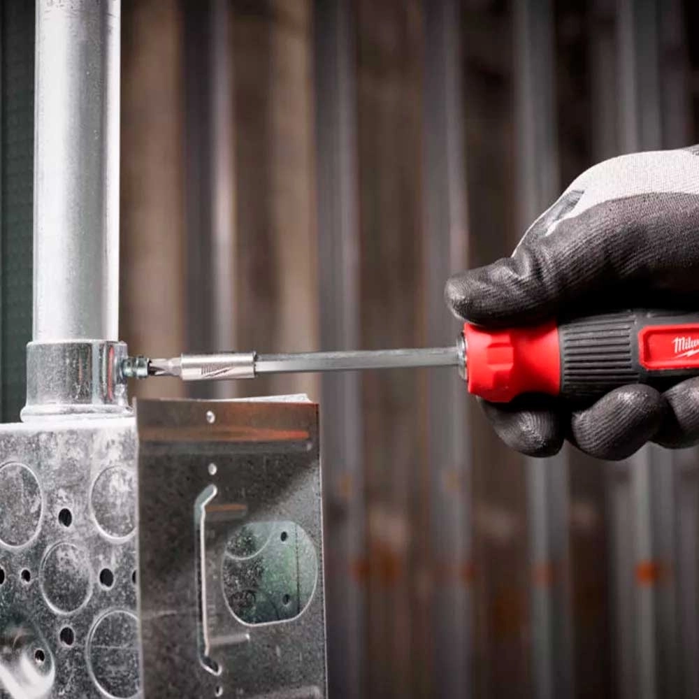 Ця універсальна викрутка Milwaukee 27-в-1 поєднує в собі міцність, зручність та багатофункціональність. Завдяки вбудованому зберіганню бітів у руків'ї, ви завжди матимете під рукою необхідні насадки. Тріскачка з металевим механізмом забезпечує високий крутний момент та швидке закручування.