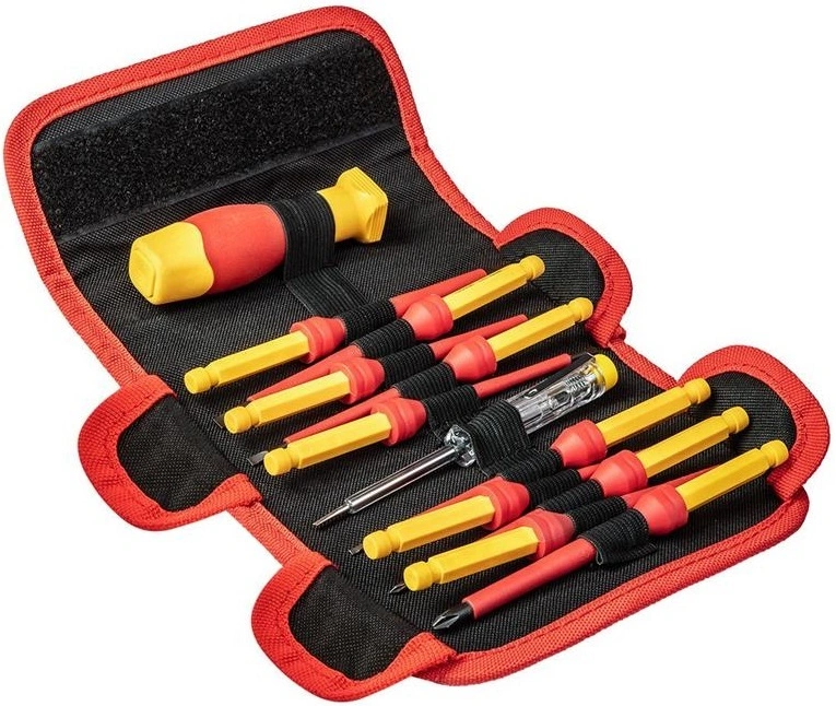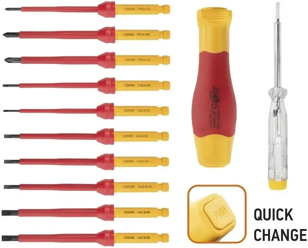Набір змінних викруткових наконечників NEO, що складається з 12 предметів, сертифікованих для роботи під напругою до 1000 В. Матеріал - легована сталь S2, завдяки якій твердість наконечників становить 60 HRC, що значно підвищує їх міцність і якість роботи. У наборі є багатий пакет наконечників стандартного та спеціалізованих типів довжиною 100 мм.