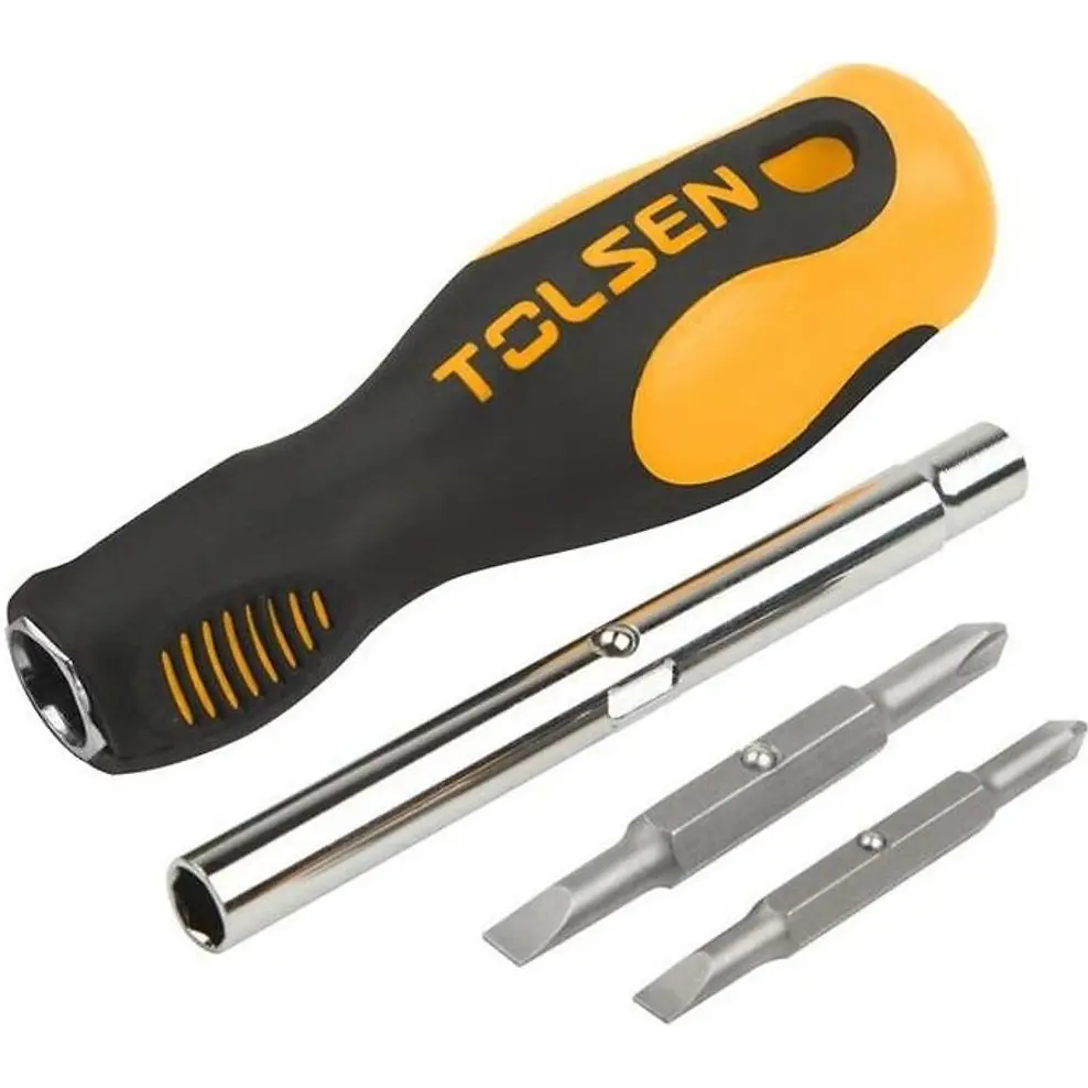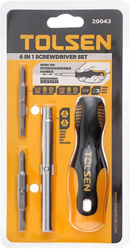Tolsen 20043 — зручна викрутка з бітотримачем і змінними двосторонніми наконечниками для багатофункціонального використання. У комплекті біти SL5 мм × PH1, SL6 мм × PH2, HEX 6.35 мм і HEX 8 мм, що дозволяють працювати з різними видами кріплень. Ергономічна ручка добре лежить у руці й не ковзає. Змінні насадки легко замінюються, економлячи місце в інструментальному ящику. Tolsen — універсальний інструмент для дому і майстерні.