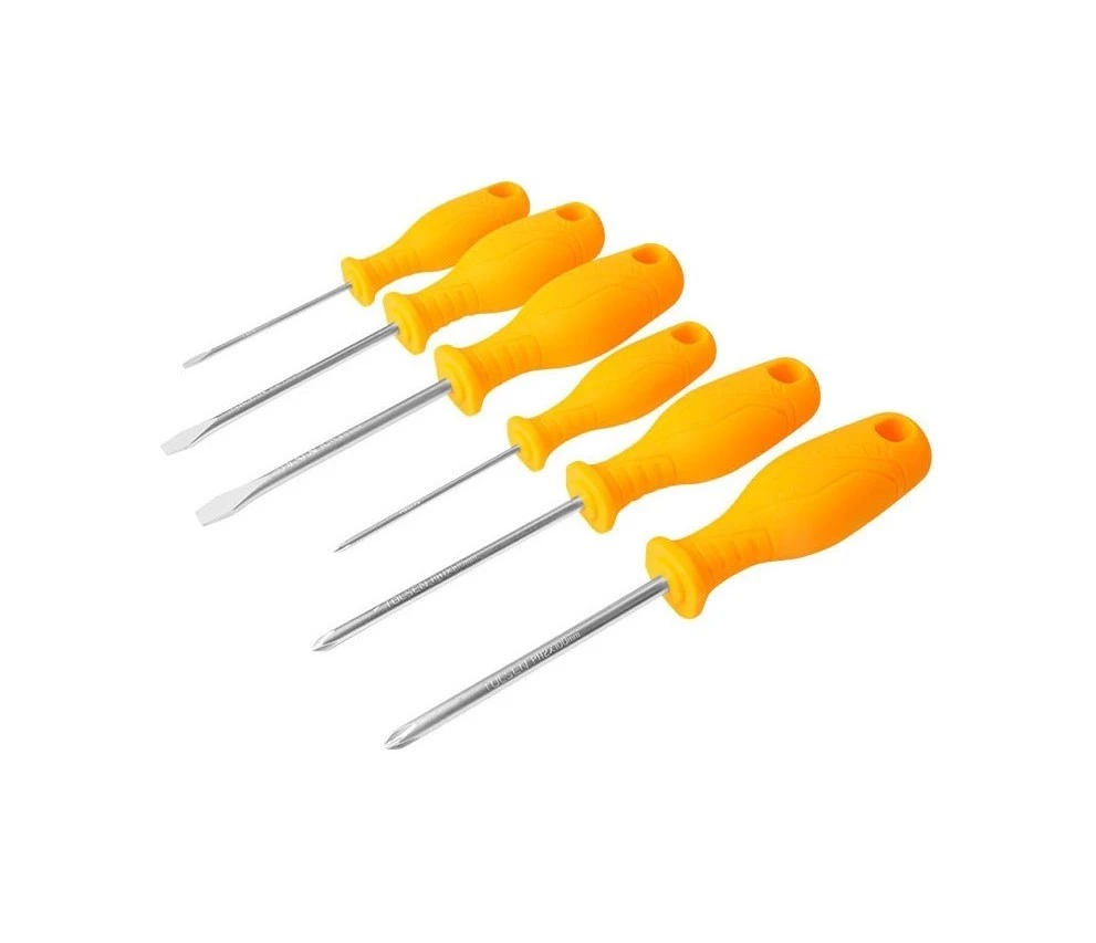 Набір викруток Tolsen 20738 (6 шт., SL, PH) – універсальний комплект для роботи з кріпленнями різних типів. Викрутки мають ергономічну рукоятку з протиковзким покриттям, яке стійке до оливи та легко очищується. Оснащені великим отвором для підвішування, що забезпечує зручне зберігання.