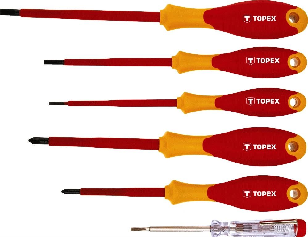 Набір викруток TOPEX, призначених для експлуатації під напругою до 1000 В. Кожна з п’яти викруток виготовлена з високоякісної хроммолібденової сталі, ізольована. Додатково до комплекту входить індикатор напруги 125-250 В. Ергономічна ручка з пластику, вкрита протиковзним матеріалом, забезпечує безпеку та комфорт під час експлуатації. Марка TOPEX адресована майстрам, які займаються дрібним ремонтом.