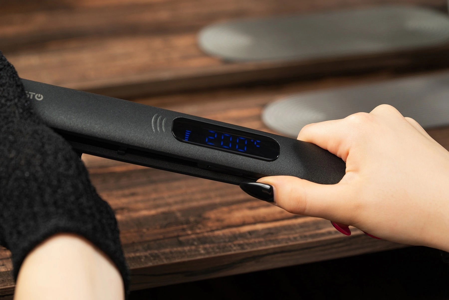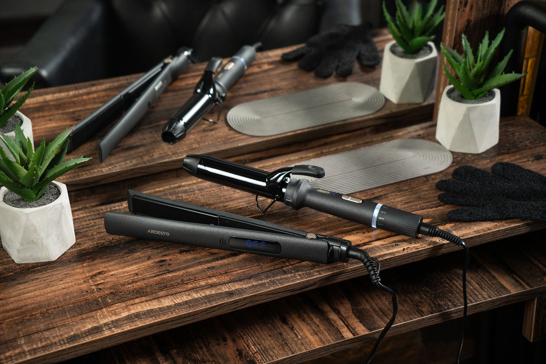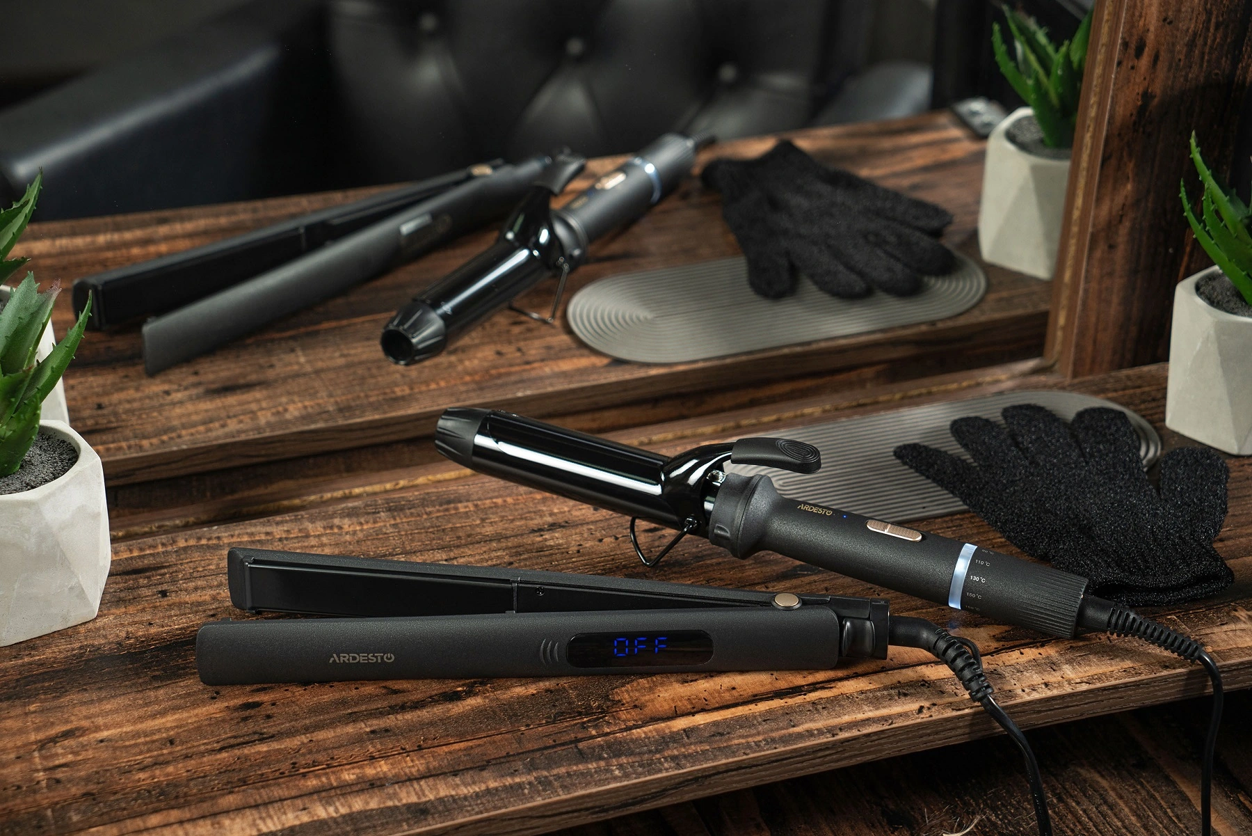Плойка чорного кольору з керамічним покриттям та електронним керуванням для випрямлення волосся та створення локонів.