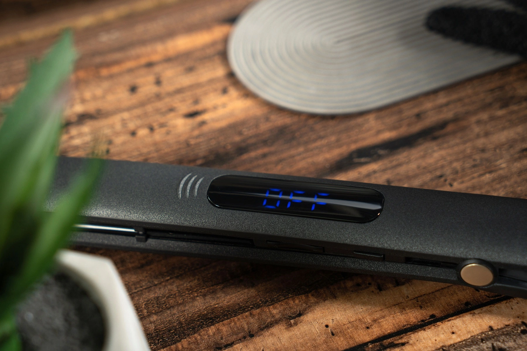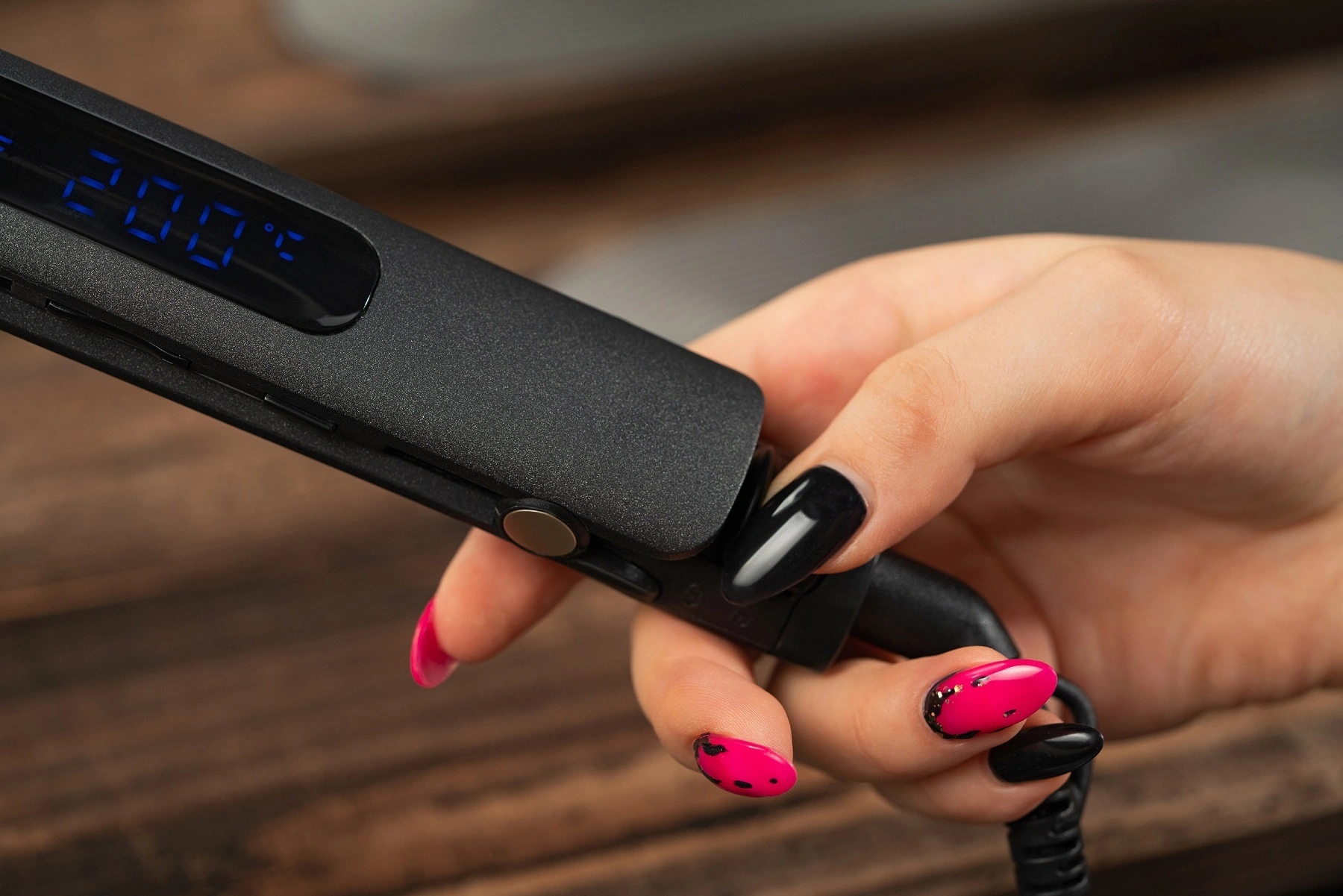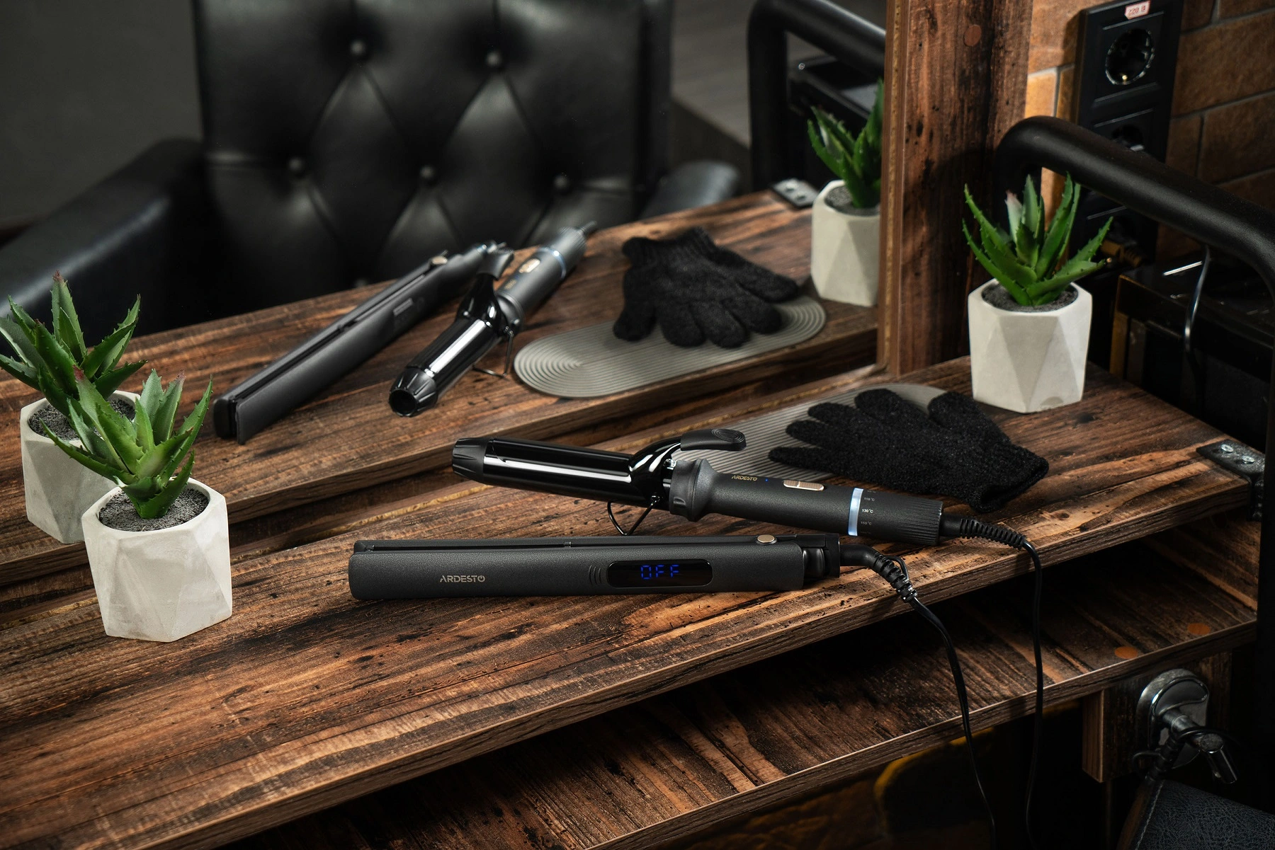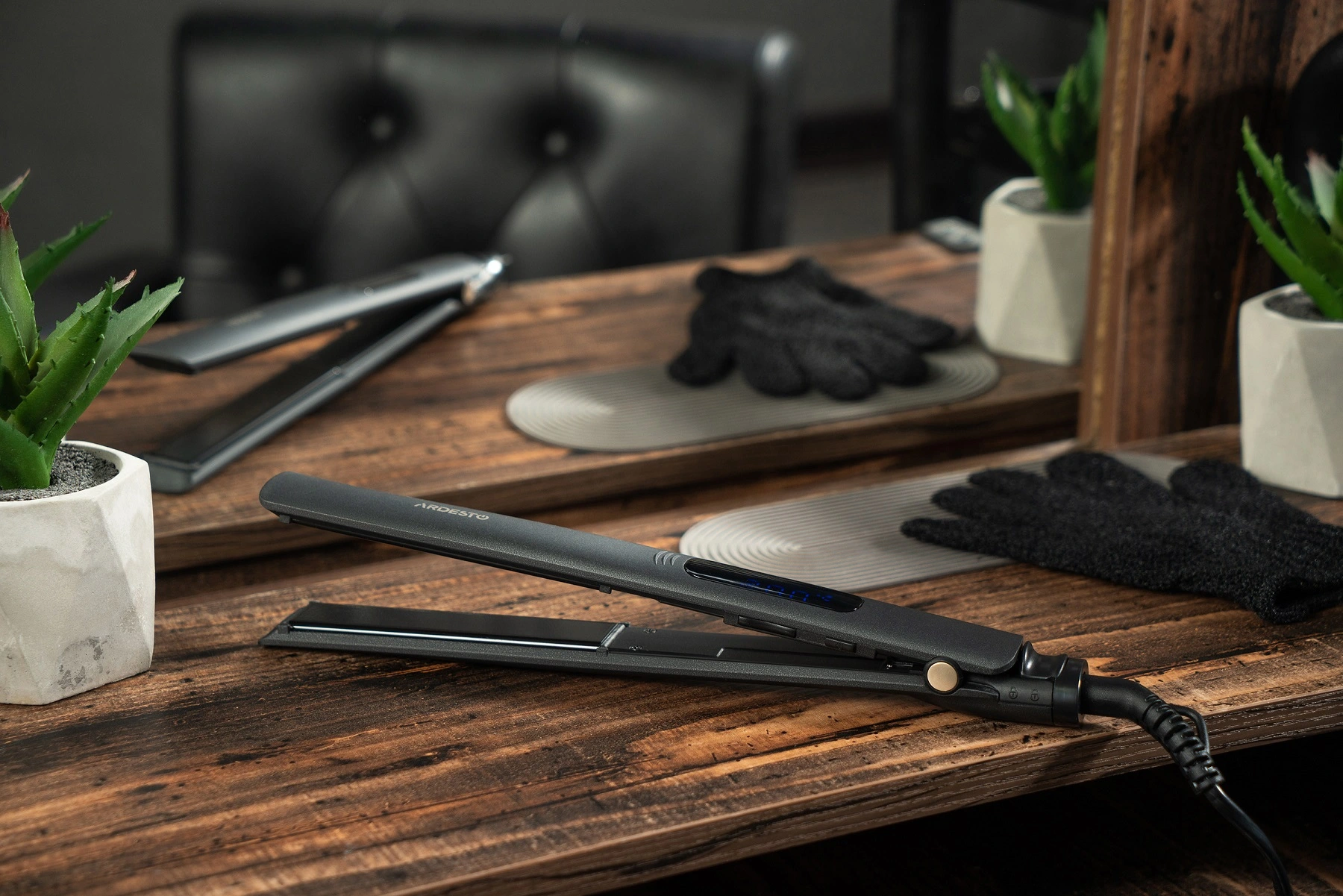 Плойка чорного кольору з керамічним покриттям та електронним керуванням для випрямлення волосся та створення локонів.