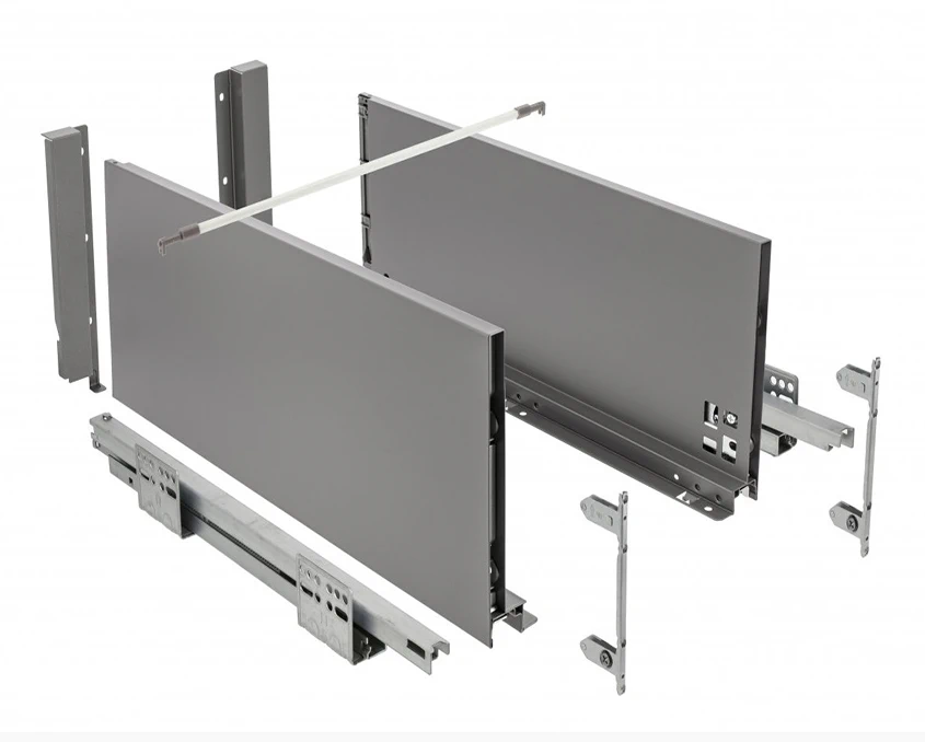 Антрацитовые боковины из стали с лаковой отделкой обеспечивают износостойкость и позволяют эффективно использовать внутреннее пространство за счёт минимальной ширины 14 мм. Система выдерживает до 40 кг нагрузки и протестирована на 60 000 циклов открытия-закрытия.