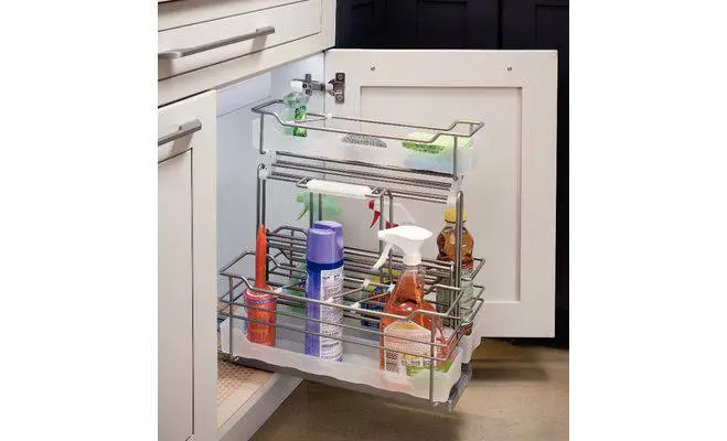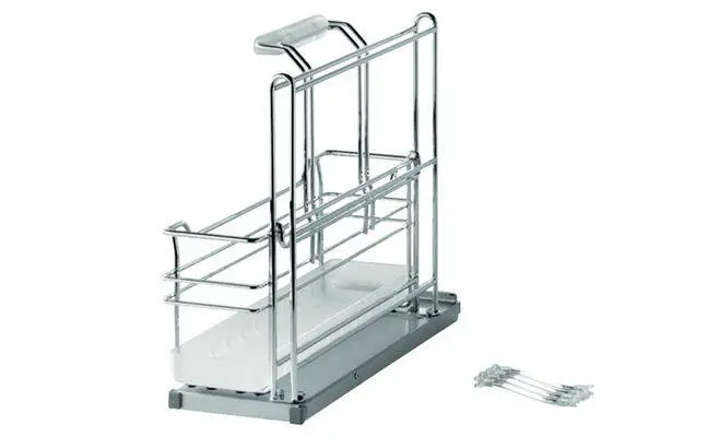 Висувний механізм для миючих засобів, з 1 навісною корзиною та знімною корзиною для пляшок, оснащений плавним самодотягом. Висувний комплект виготовлений з хромованої сталі, піддон виготовлений з пластмаси. Несуча здатність висувного механізму 6 кг, розмір: ширина 160 мм, довжина 468 мм, висота 395 мм. Монтаж виконується шляхом кріплення до нижньої панелі шафи. Висувний механізм застосовується для монтажу в шафі під мийкою біля сміттєзбірника.