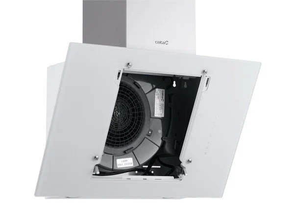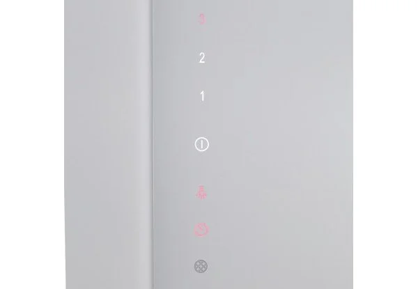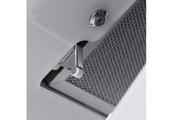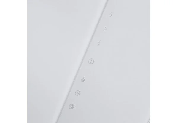 Белый стеклянный фасад придает элегантности интерьеру, а сенсорное управление упрощает использование. Вытяжка оснащена несколькими скоростями, светодиодной подсветкой и может работать в режимах отвода воздуха и рециркуляции.