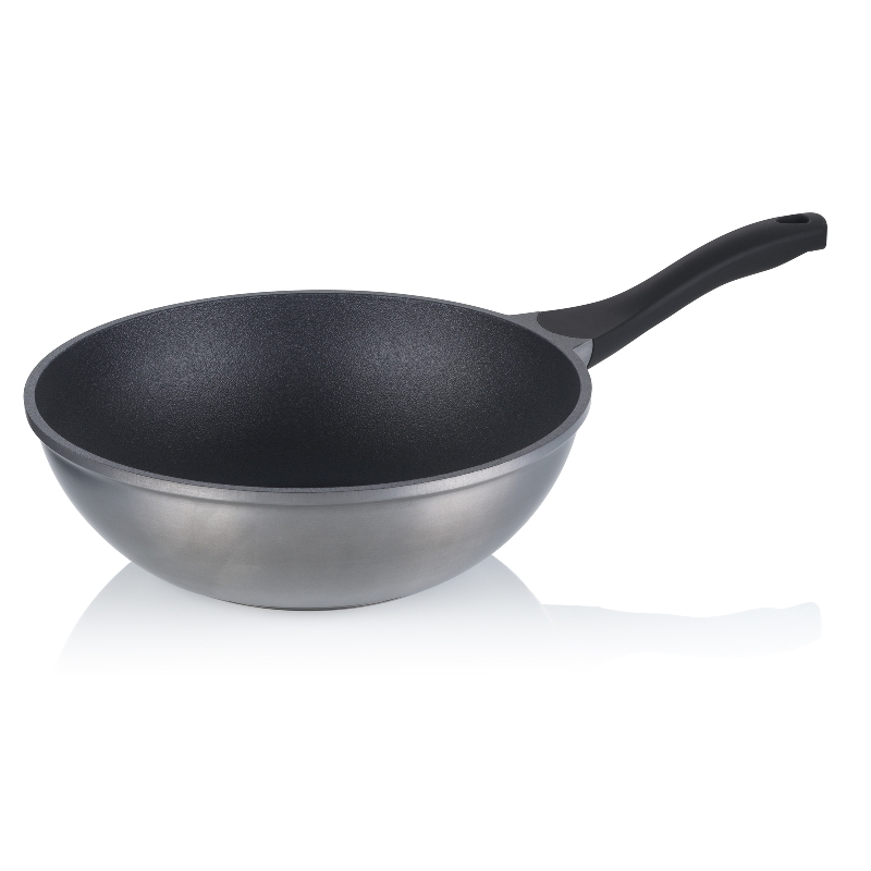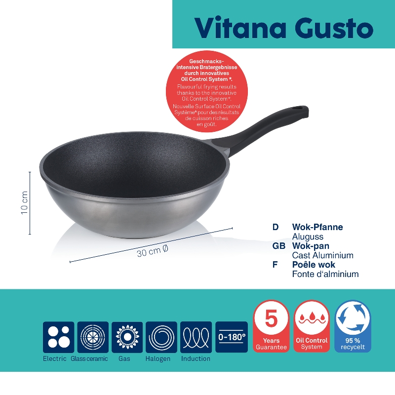 Корпус вок KELA Vitana Gusto з литого алюмінію з інноваційною структурою поверхні: невеликі заглиблення в корпусі сковороди (не у покритті) забезпечують хрустку скоринку з інтенсивним смаком. Матеріал повністю підходить для вторинної переробки.
