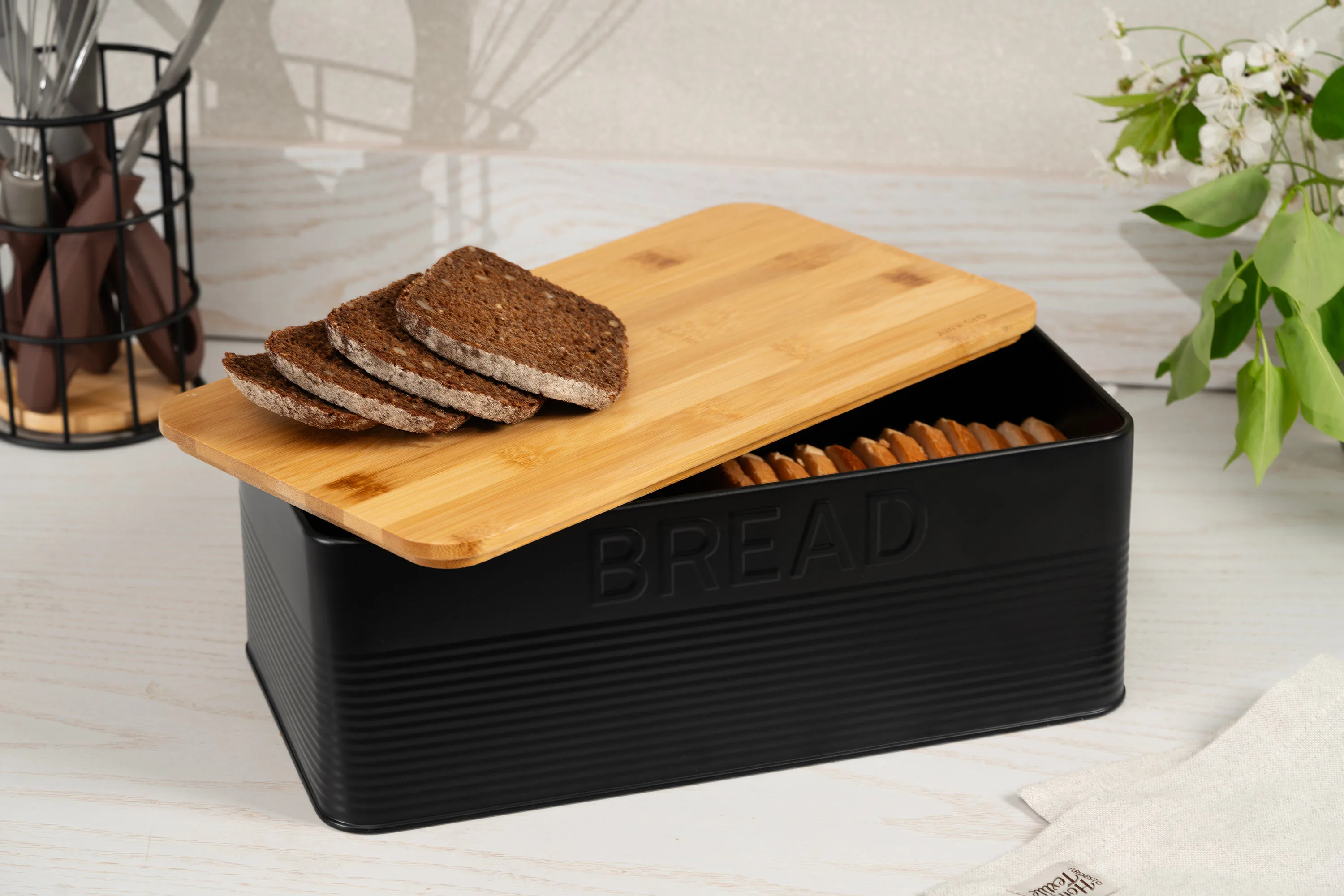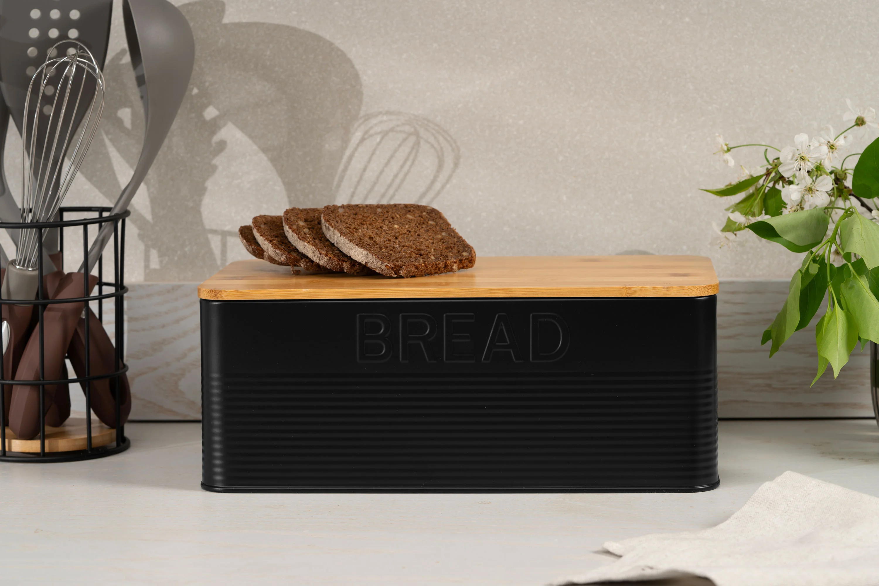 У хлібниці ARDESTO Midori хлібобулочні вироби залишаться свіжими надовго. Герметична кришка запобігає висиханню та псуванню, а також захищає від вологи. Конструкцію прямокутної форми з рельєфними стінками розміром 33 × 13 × 18 см виготовлено з металу чорного кольору та доповнено бамбуковою кришечкою, тож вона вдало пасуватиме чи не на будь-якій кухні. Доглядати за виробом нескладно, проте не рекомендовано мити в посудомийній машині.