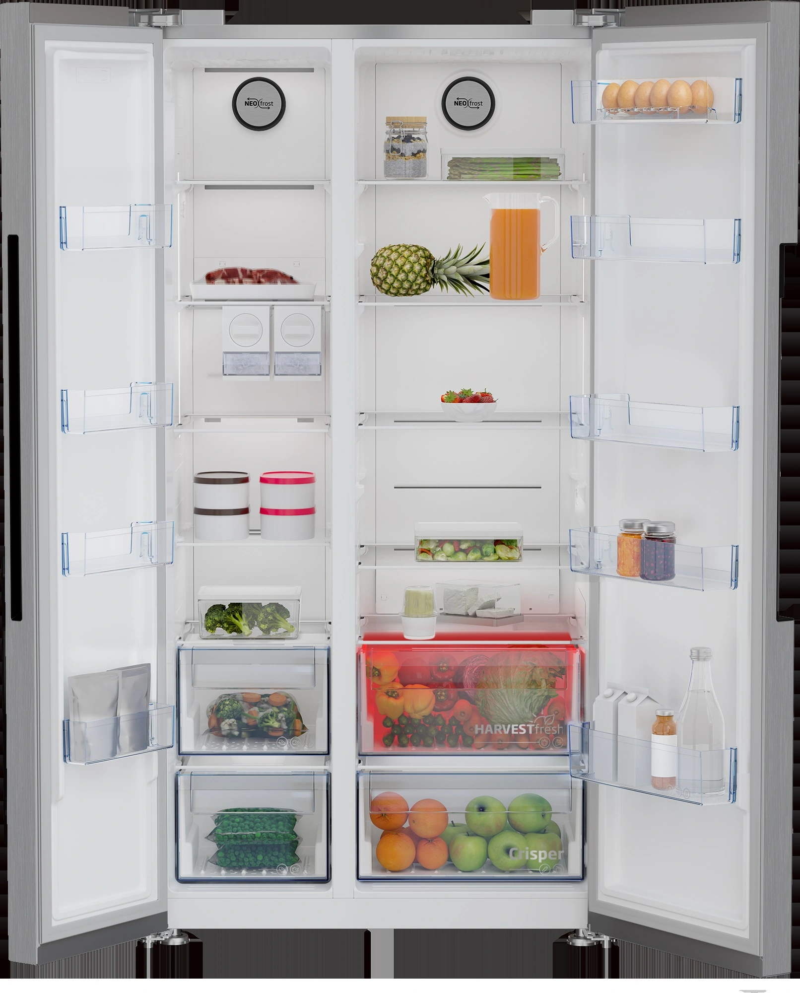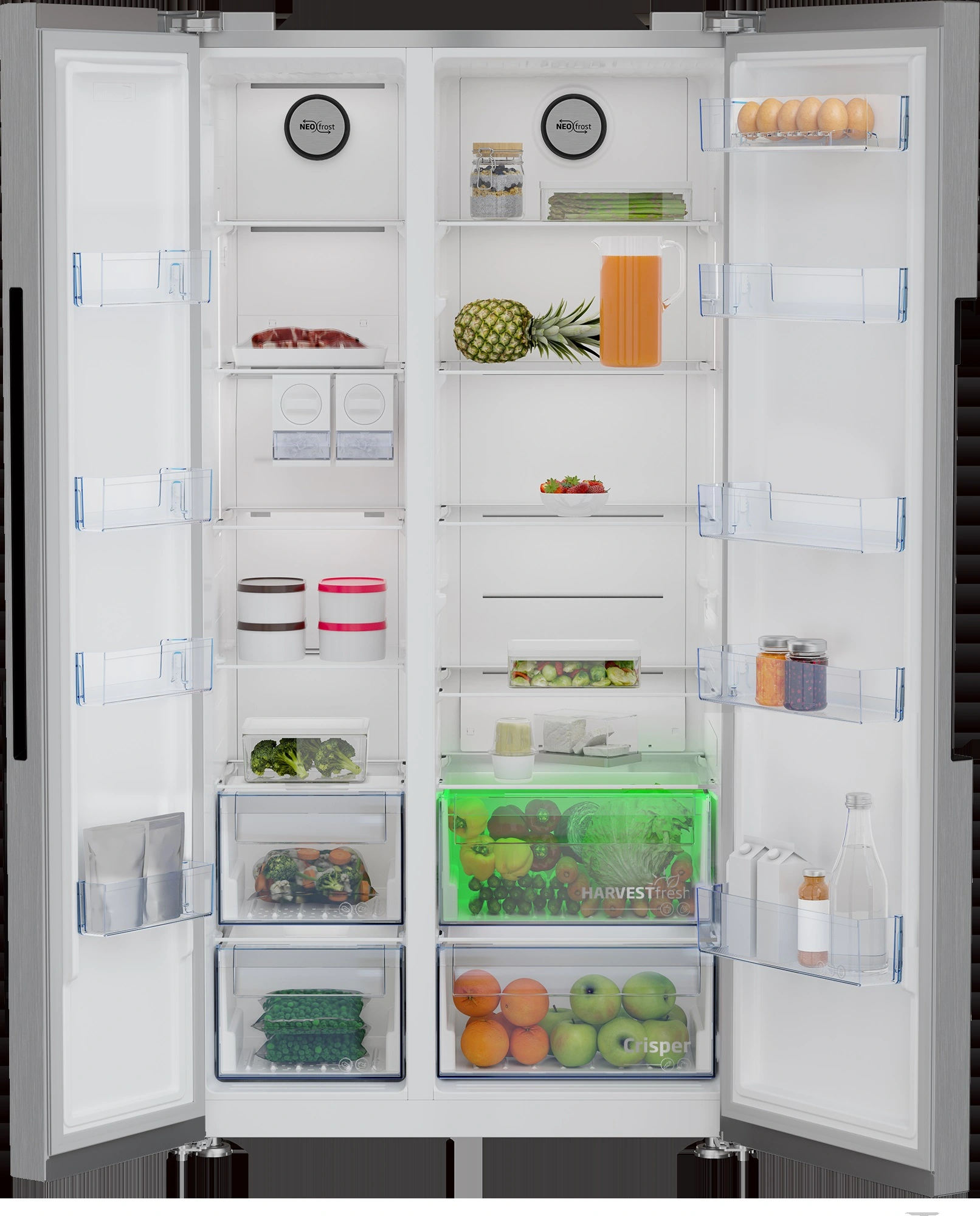 HARVESTfresh™. Технологія, натхненна природою та силою світла. Вітаміни у овочах і фруктах більше не пропадуть при зберіганні в холодильнику. Новітня технологія HARVESTFresh зі світлом 3-х кольорів імітує 24-годинний сонячний цикл всередині вашого холодильника, що дозволяє зберегти вітаміни довше. Таким чином, даючи вам можливість насолоджуватись більш поживним раціоном та здоровим життям. Технологія двоконтурного охолодження NeoFrost™. Дві окремі системи охолодження без перенесення запахів. Дуже важко уникнути змішування запахів їжі, коли ви зберігаєте рибу в морозильній камері й торт із кремом у холодильній. Дві окремі системи з технологією двоконтурного охолодження NeoFrost™ для кожного відділення забезпечують ідеальний потік повітря й оптимальну температуру в морозильній камері та в холодильнику. Завдяки цьому їжа залишається свіжою довше, не обмерзає та не вбирає сторонні запахи.