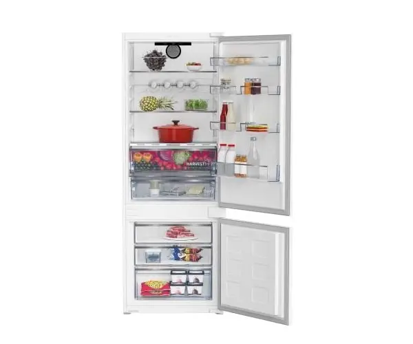 Вбудований холодильник з корисним об'ємом 370 л, шириною 69 см з дверима, що перенавішуються, нижнім розташуванням морозильної камери і класом енергоефективності А++. Оснащений системою охолодження NoFrost, завдяки якій не потрібно регулярно розморожувати холодильник. Має спеціальний режим відпустки для оптимального розподілу електроенергії під час тривалої відсутності будинку. У холодильнику передбачена зона свіжості 0-3˚C, форма для кубиків льоду, хромована полиця для пляшок, сигнал відкритих дверей та спеціальне відділення для овочів та фруктів з технологією трьох кольорів HarvestFresh для тривалого збереження вітамінів у свіжих продуктах.