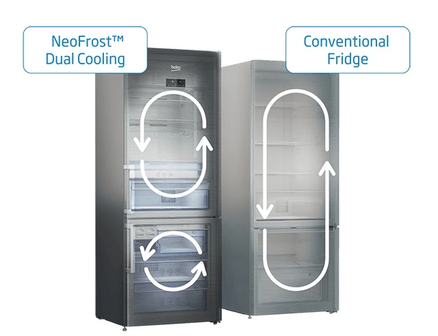 Подвійна система охолодження NeoFrost™. 2 окремі системи охолодження, жодного поширення запахів. Складно зберігати рибу в морозильній камері, а ароматний пиріг у холодильнику, щоб їх запахи не змішувалися. Технологія NeoFrost™ із двома окремими системами охолодження для кожного відділення забезпечує ідеальну циркуляцію повітря та оптимальну температуру як у холодильній, так і морозильній камері. В результаті продукти довше залишаються свіжими без утворення льоду та сторонніх запахів.
