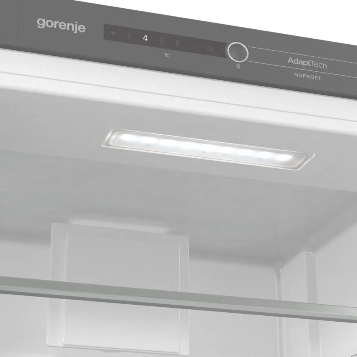 Технологія AdaptTech підтримує в холодильнику Gorenje оптимальну температуру незалежно від того, наскільки часто відчиняються дверцята. Холодильник постійно спостерігає та аналізує, як саме його використовують. LED освітлення забезпечує відмінну ефективність та яскравість. Міцні та готові до навантаження петлі дозволяють зберігати більше продуктів на полицях дверцят. Контейнер FreshZone ідеальний для зберігання м’яса, риби, фруктів та овочів. Функція FastFreeze заморожує продукти при температурі –24 °C, щоб зберегти більшу частину мінералів. Позиції міцних полиць із загартованого скла дуже легко можна відрегулювати, вийняти чи встановити у холодильник.