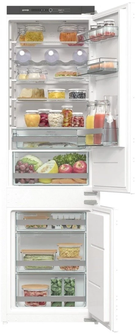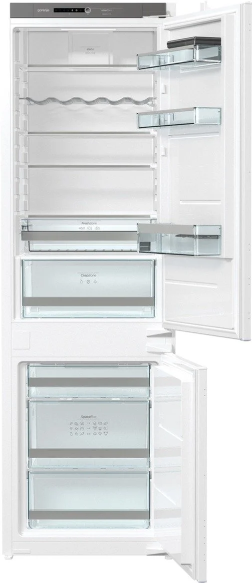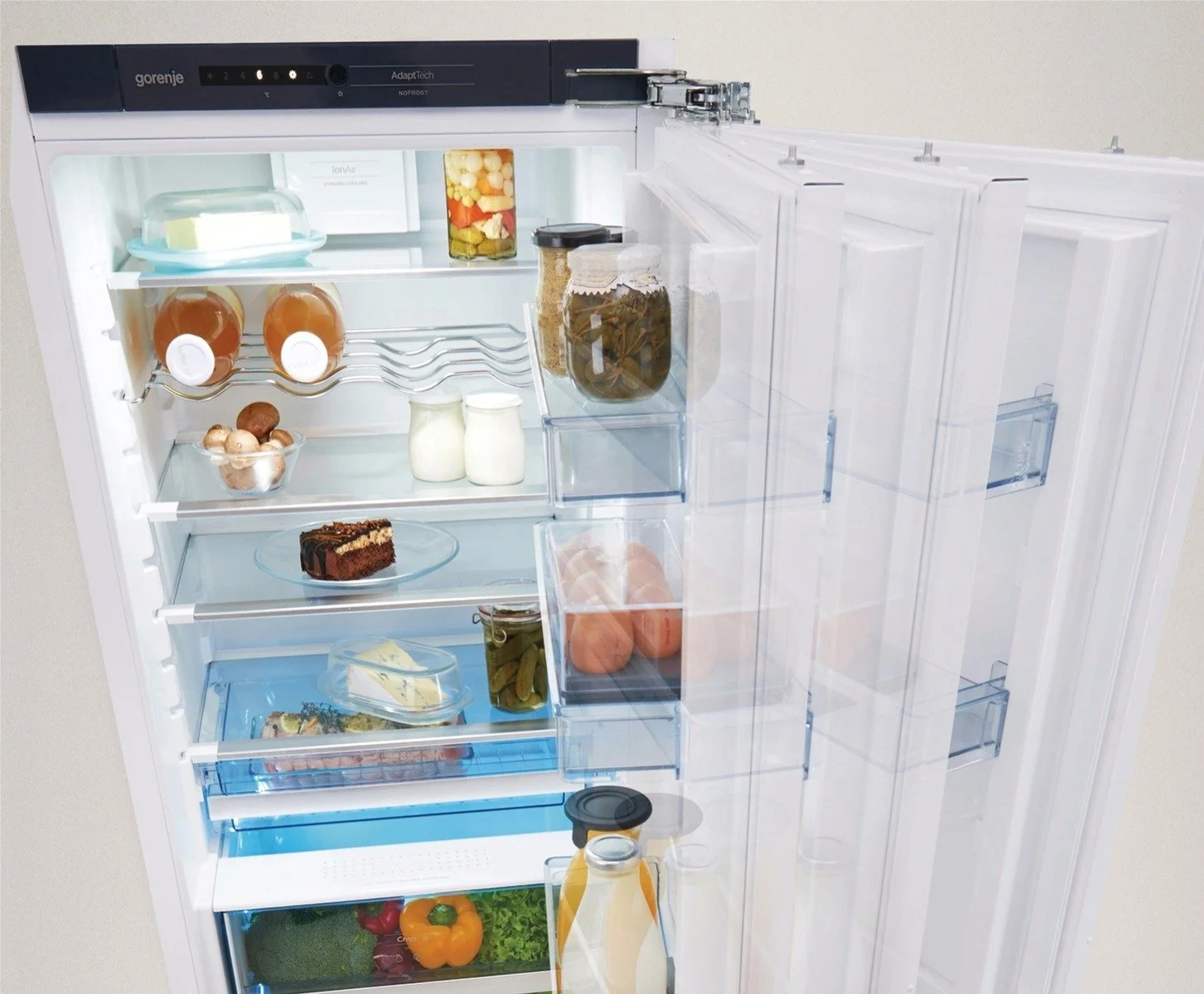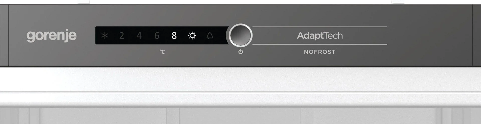 Вбудований холодильник Gorenje NRKI4182A1 (177х55х54 см) із нижньою морозильною камерою та двома дверцятами має загальний корисний об’єм 248 л (холодильник – 180 л, морозильник – 68 л). Оснащений системою NoFrost DualAdvance, інтелектуальною системою охолодження AdaptTech, технологіями IonAir та DynamiCooling.