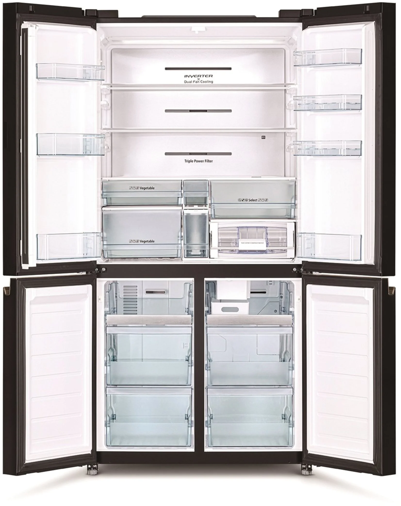 Холодильник Hitachi R-WB720VUC відноситься до двокамерних агрегатів великого об'єму. Містка модель об'ємом 568 л розрахована на велику родину, здатна зберігати свіжі продукти для 5-7 осіб. Вишуканий скляний фасад чорного кольору прикрасить будь-яку кухню. Габарити чималі: ширина – 90 см, глибина – 72 см, висота – 184 см. Нижнє розташування морозилки зручне для користування навіть за такої висоти холодильника. У агрегату 4 двері, що дозволяє відкриваючи холодильник, краще зберігати температуру всередині. Інверторний компресор зі штучним інтелектом. Автоматичний льодогенератор. Відділення для овочів з вологим охолодженням. Фільтр Nano Titanium. Dual Fan Cooling - два вентилятори, в камерах повітря не змішується