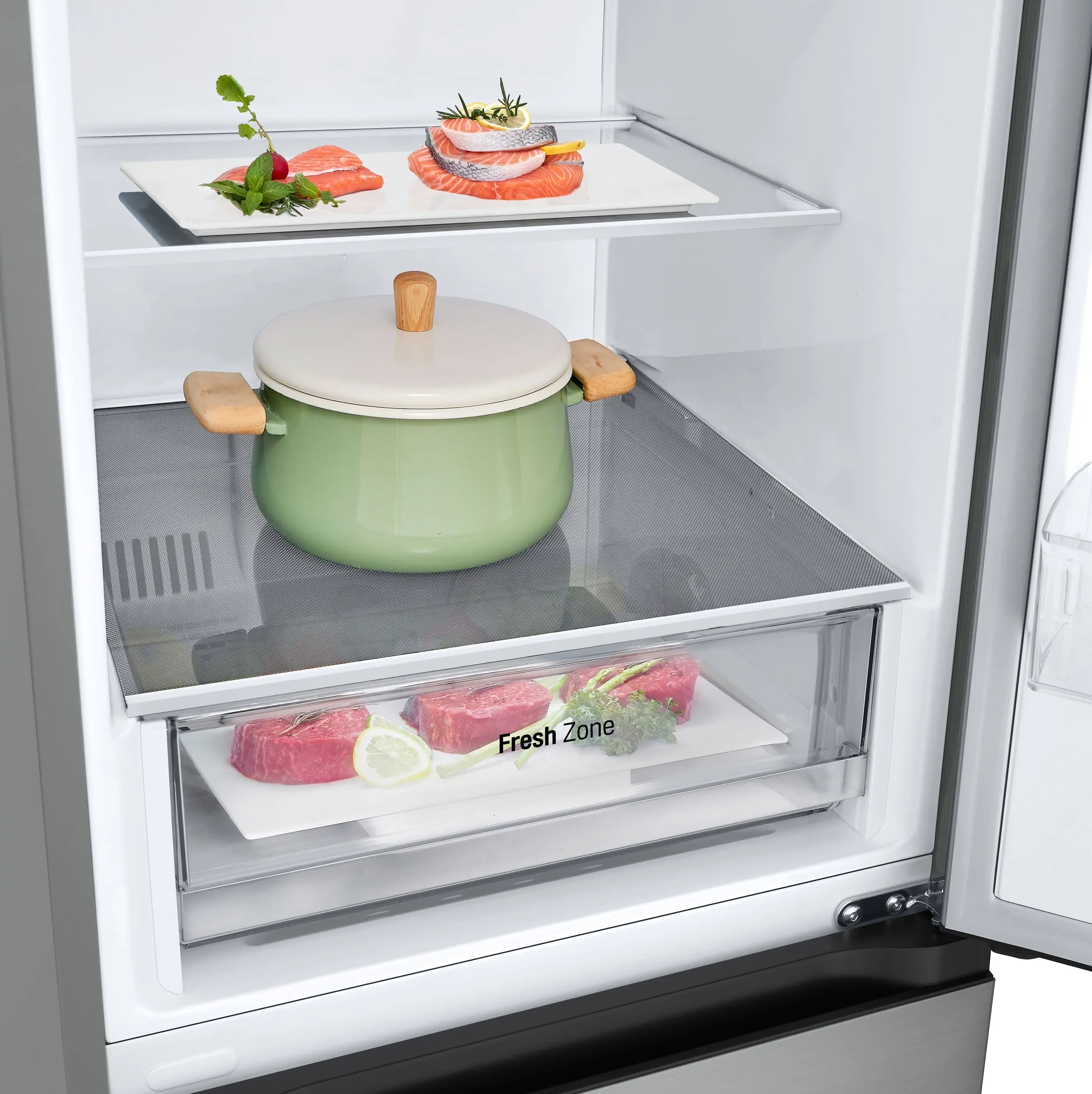 Холодильник LG GW-B459FNLW з нижньою морозильною камерою - це сучасне рішення для зберігання продуктів. Завдяки інверторному компресору, Total No Frost, функції DoorCooling+ і інтелектуальній діагностиці Smart Diagnosis, він забезпечує стабільне охолодження з низьким рівнем шуму (35 дБ). Об’єм 341 л, зручні прозорі ящики, LED-підсвітка, велика морозильна камера з функцією швидкої заморозки - все для вашого комфорту. Платиново-сріблястий корпус доповнює сучасний дизайн. Клас енергоефективності A++.