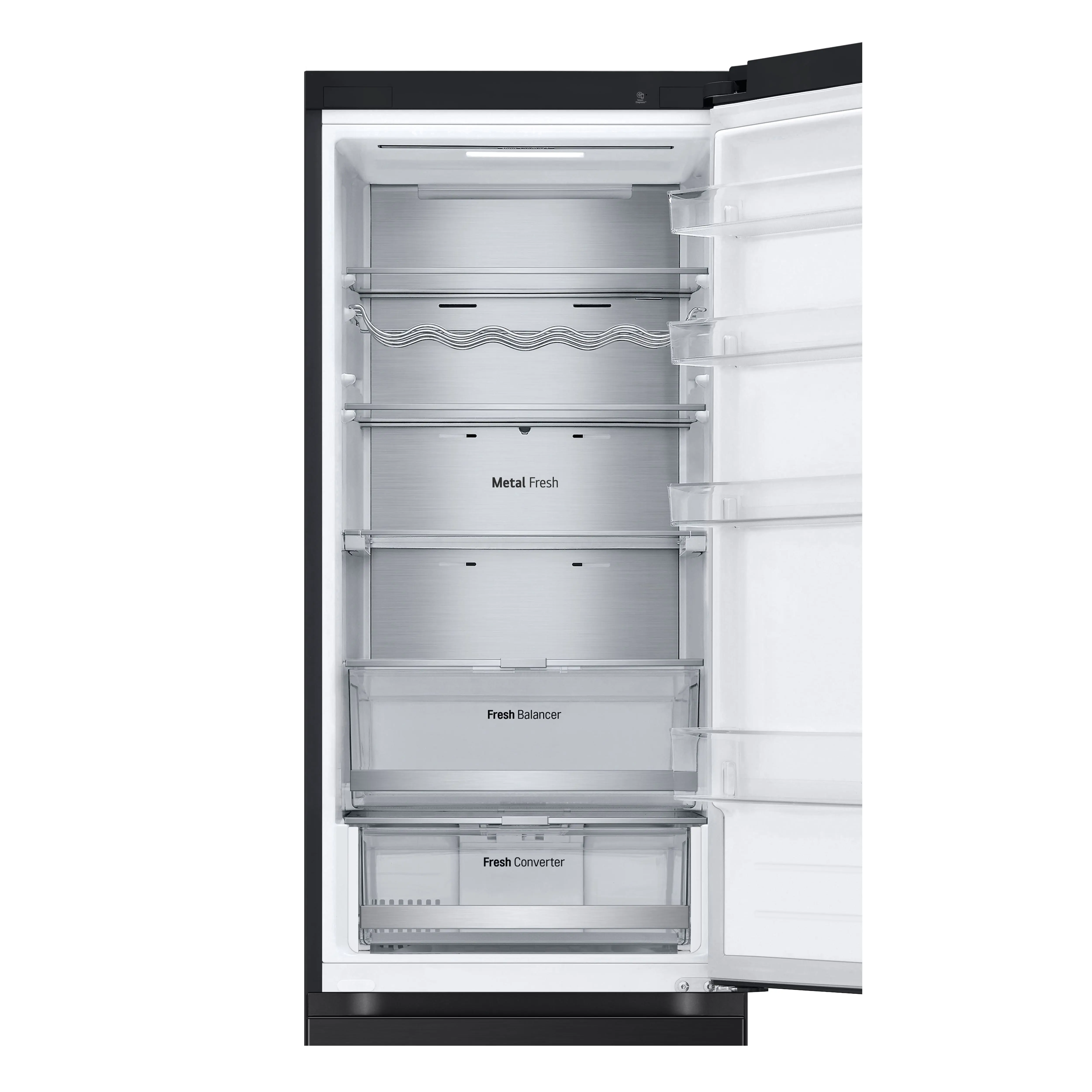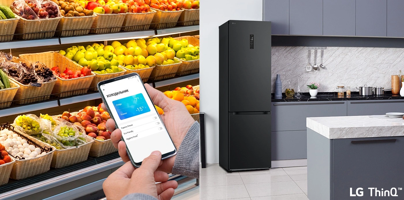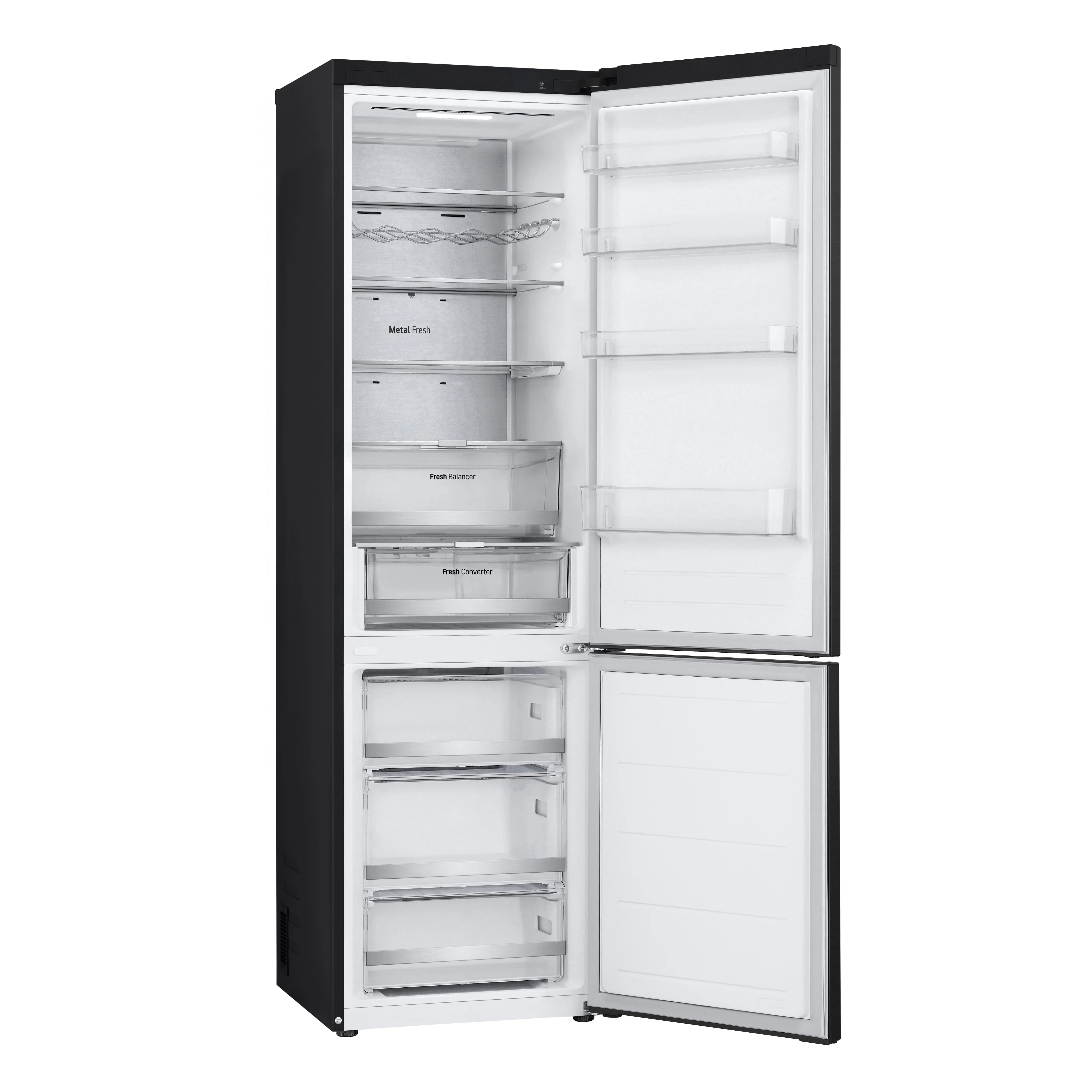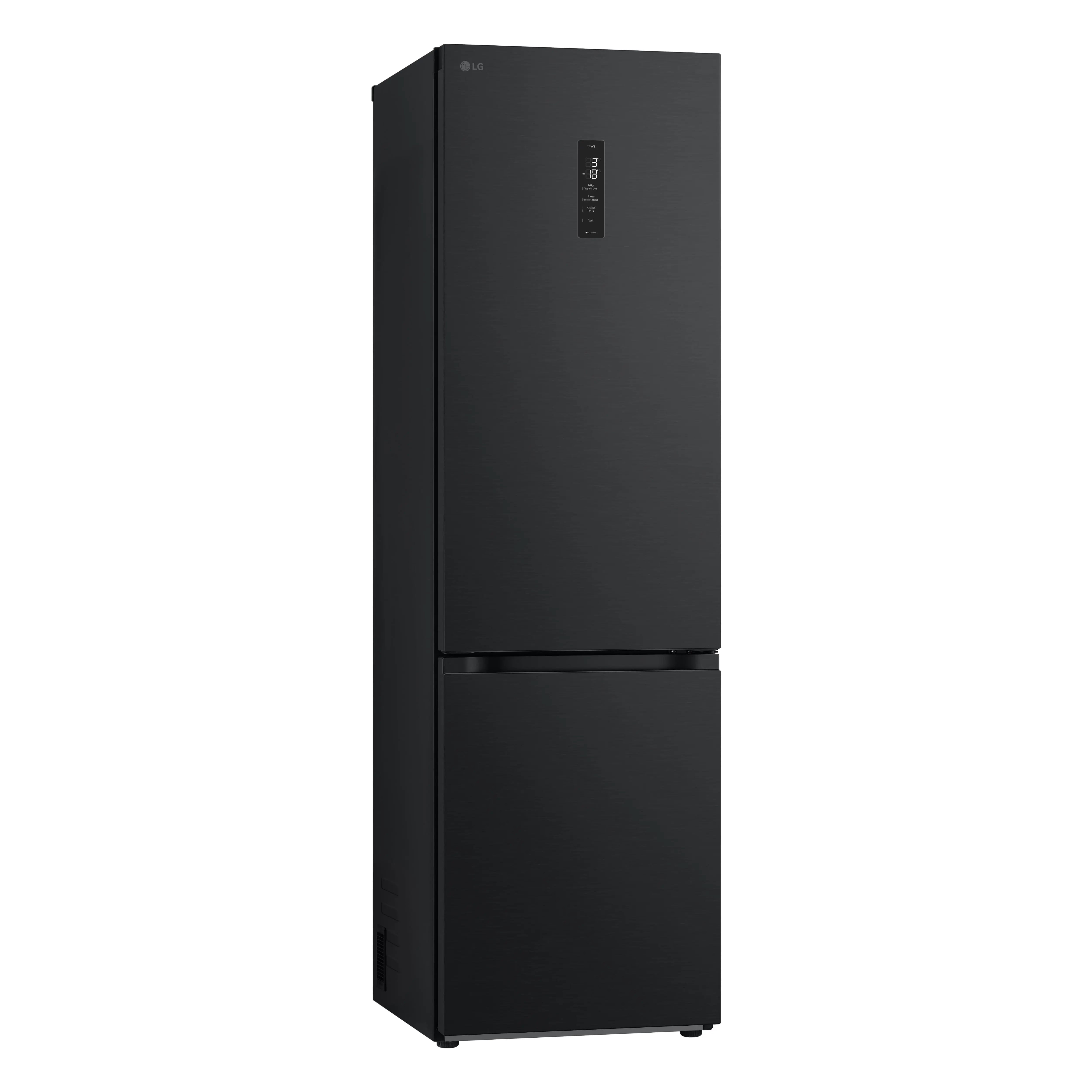 Сучасний холодильник з об’ємом 384 л, нижньою морозильною камерою на 107 л і тихою роботою (35 дБ). Інверторний компресор і технологія Total No Frost забезпечують ефективне охолодження без інею. Оснащений DoorCooling+, зонами свіжості Fresh Balancer і Fresh Converter, Wi-Fi-керуванням LG ThinQ, дисплеєм, LED-підсвіткою та складаною полицею. Енергетичний клас A++, споживання – 288 кВт/рік.