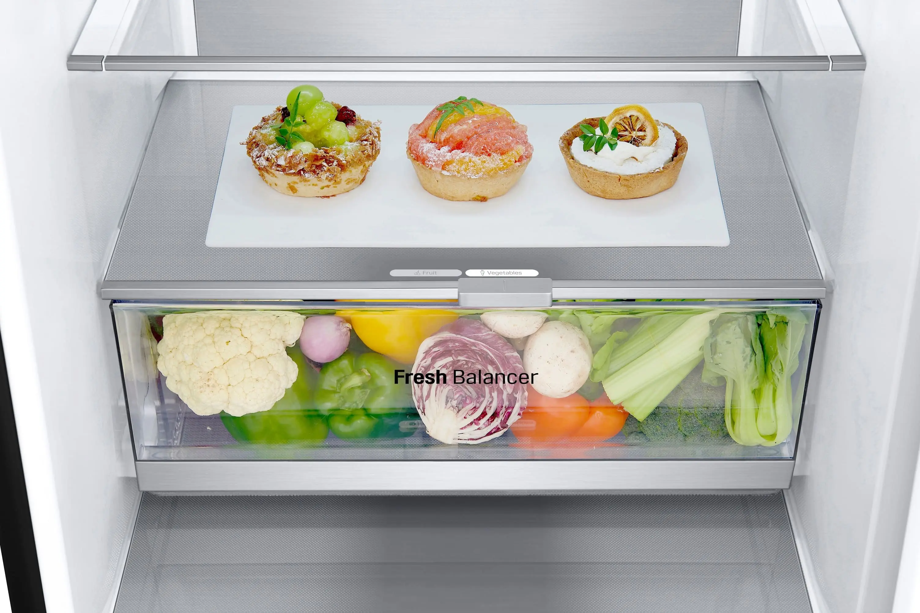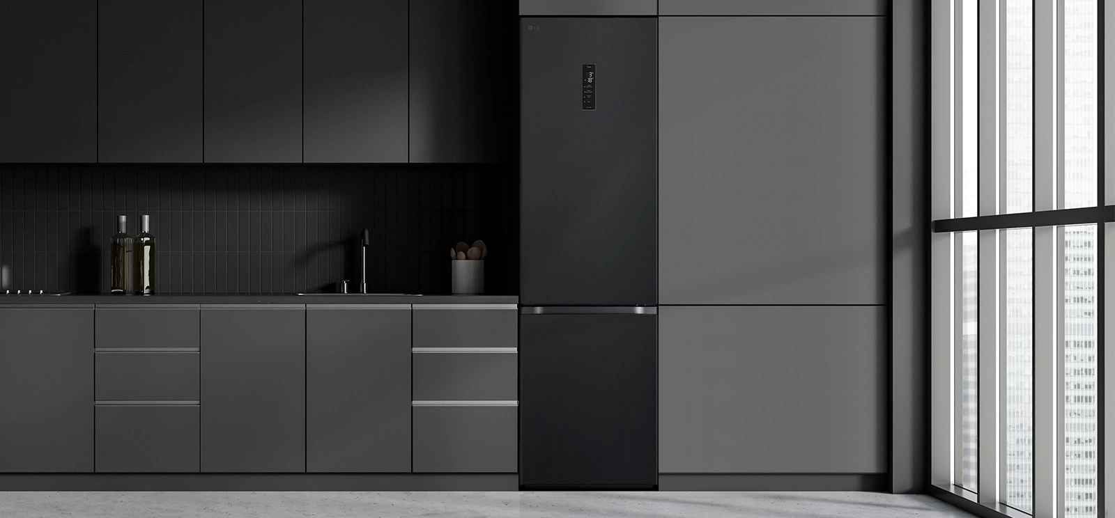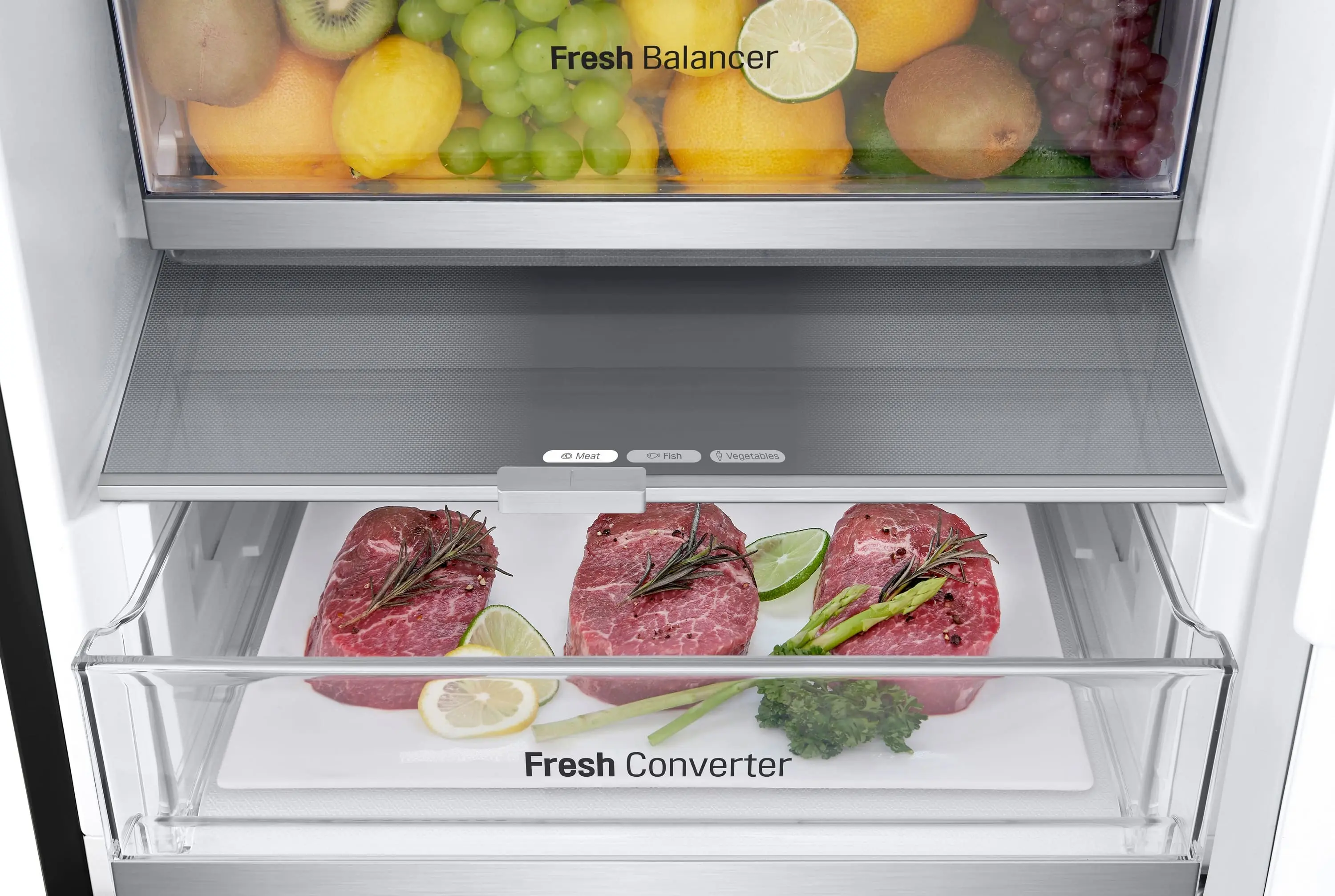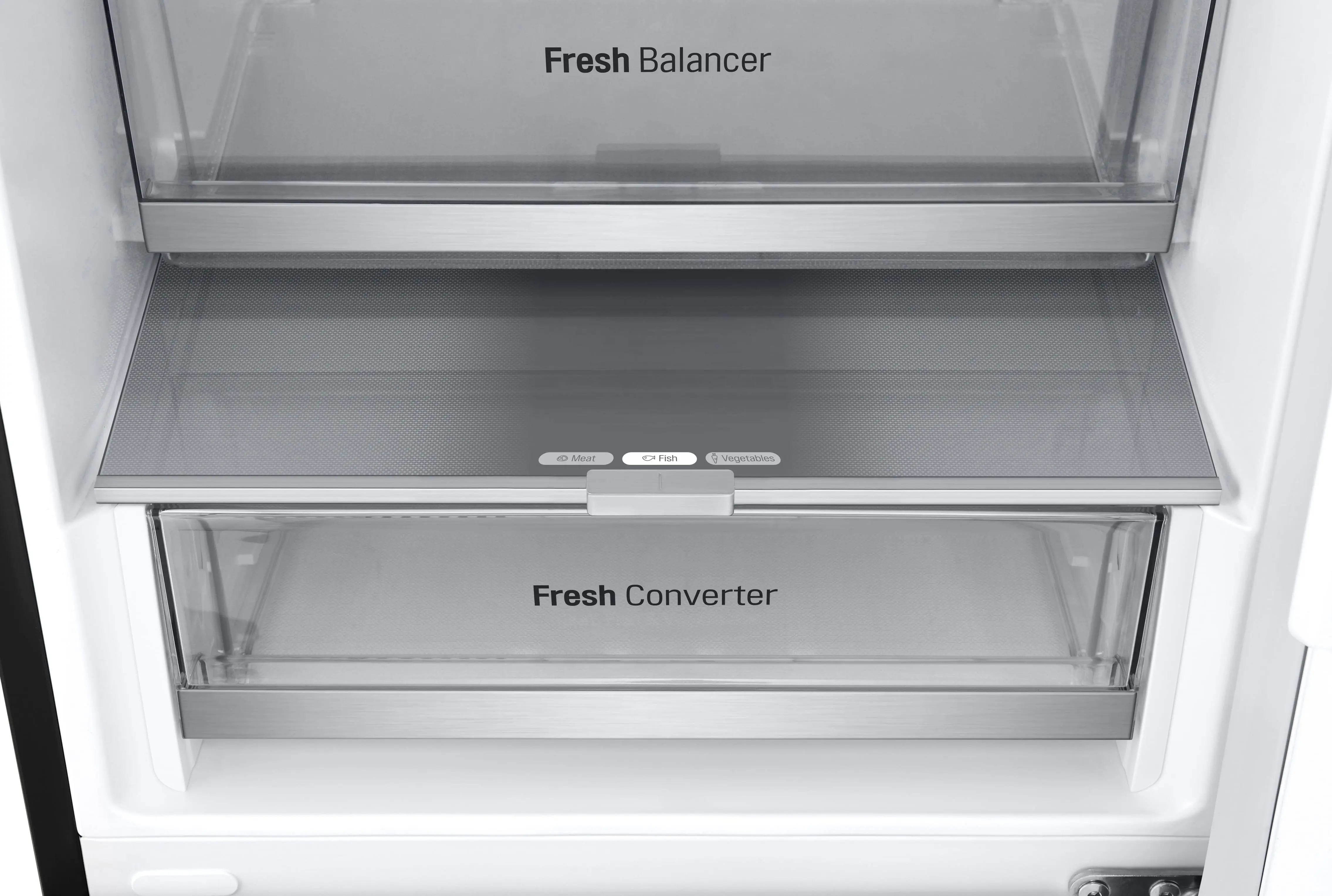 Сучасний холодильник з об’ємом 384 л, нижньою морозильною камерою на 107 л і тихою роботою (35 дБ). Інверторний компресор і технологія Total No Frost забезпечують ефективне охолодження без інею. Оснащений DoorCooling+, зонами свіжості Fresh Balancer і Fresh Converter, Wi-Fi-керуванням LG ThinQ, дисплеєм, LED-підсвіткою та складаною полицею. Енергетичний клас A++, споживання – 288 кВт/рік.