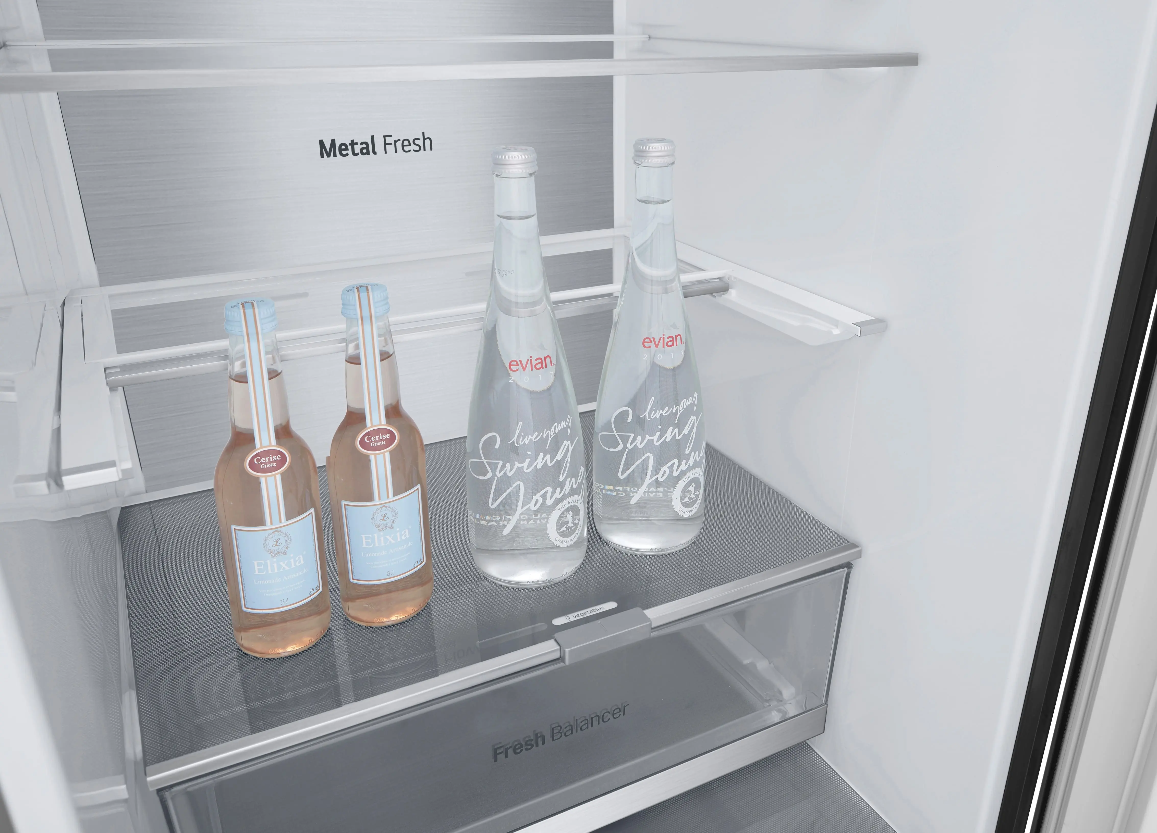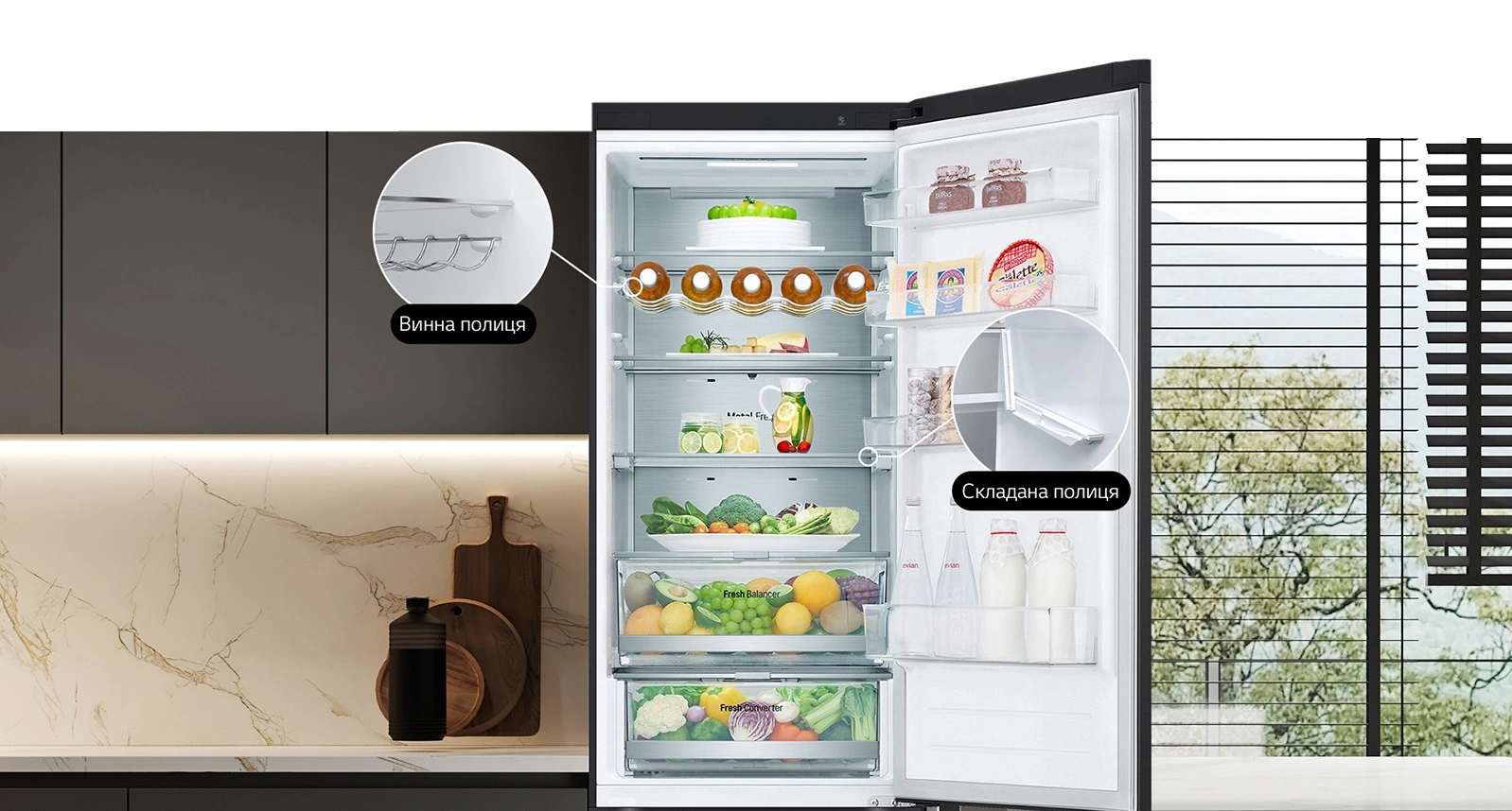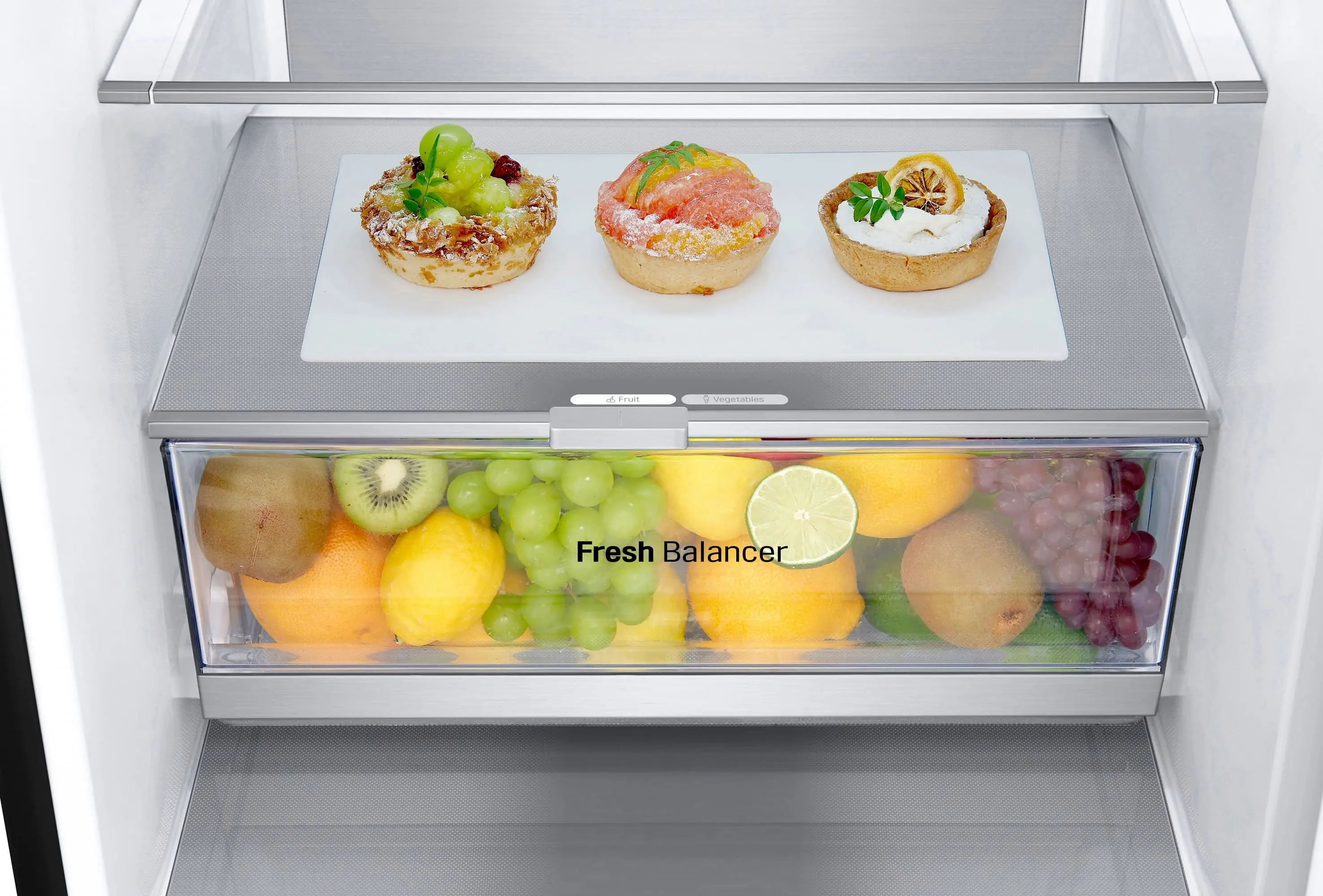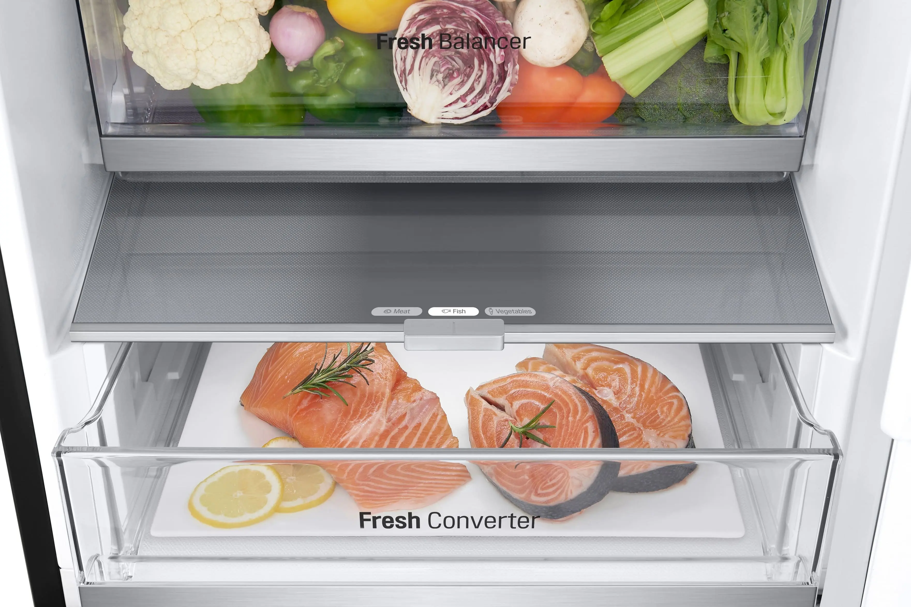 Сучасний холодильник з об’ємом 384 л, нижньою морозильною камерою на 107 л і тихою роботою (35 дБ). Інверторний компресор і технологія Total No Frost забезпечують ефективне охолодження без інею. Оснащений DoorCooling+, зонами свіжості Fresh Balancer і Fresh Converter, Wi-Fi-керуванням LG ThinQ, дисплеєм, LED-підсвіткою та складаною полицею. Енергетичний клас A++, споживання – 288 кВт/рік.
