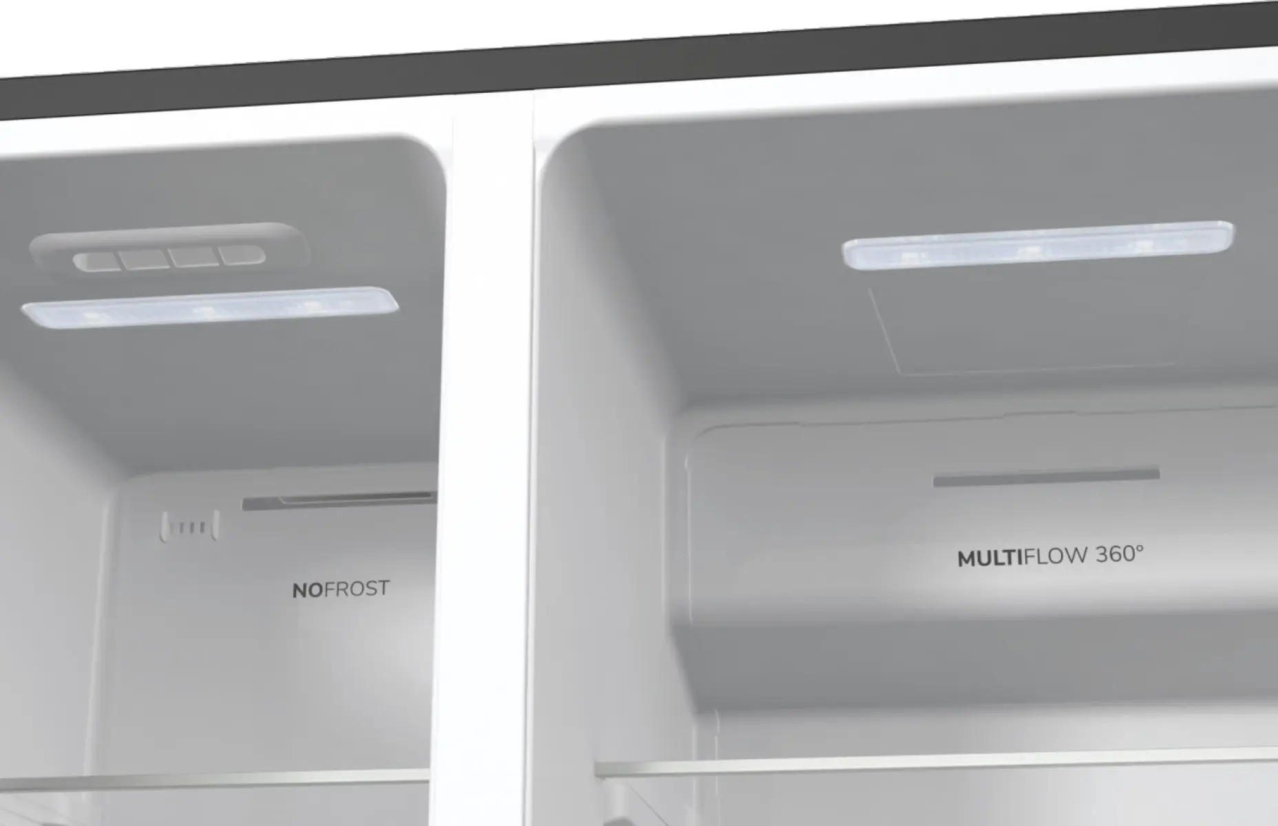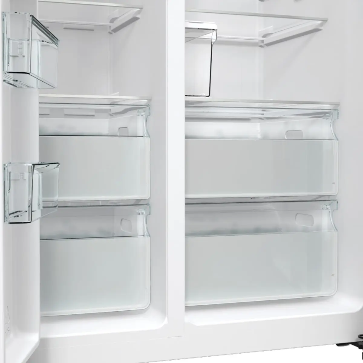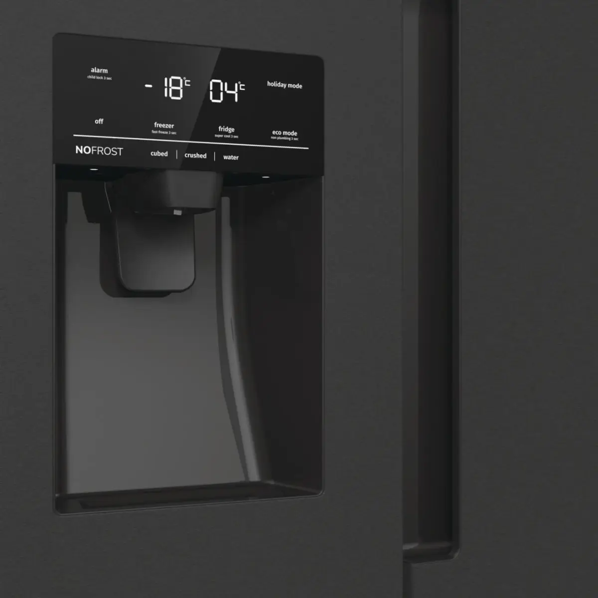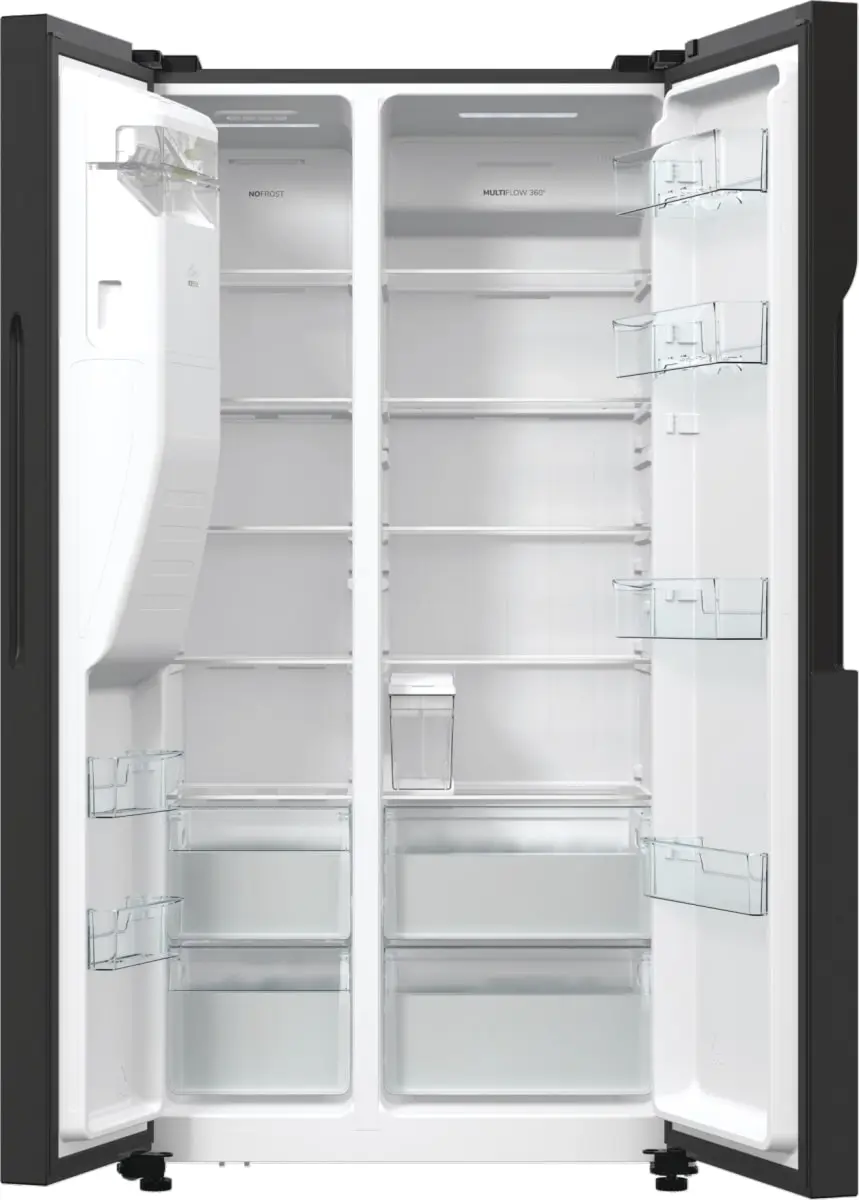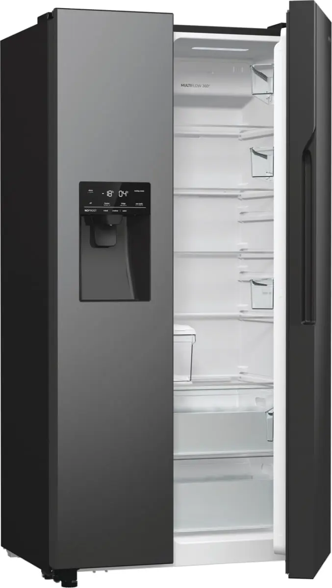 Холодильник SBS Gorenje NRR9185ESBXL оснащений шухлядою CrispZone, яка зберігає свіжість продуктів завдяки низькій температурі. Функція FastFreeze швидко заморожує продукти при -24°C, а режим «Відпустка» та EcoMode знижують енергоспоживання під час тривалої відсутності. Інверторний компресор забезпечує тихішу роботу та стабільну температуру. MultiFlow 360° рівномірно розподіляє повітря для оптимального зберігання, а NoFrost запобігає намерзанню льоду. Світлодіодне освітлення економить енергію, а дозатор для води додає зручності.