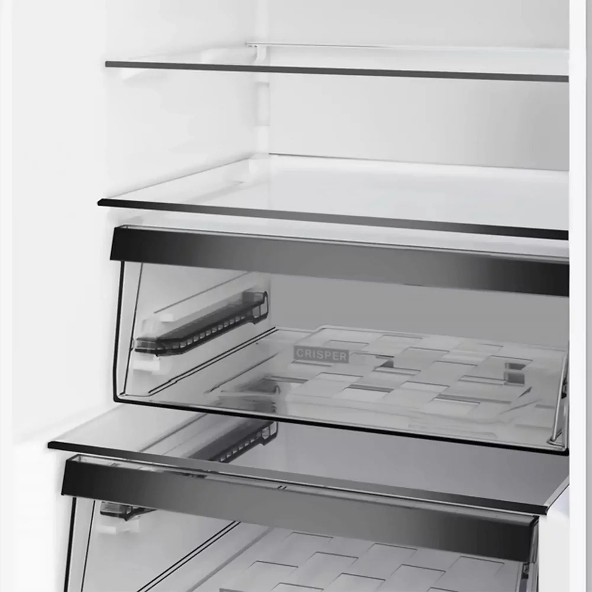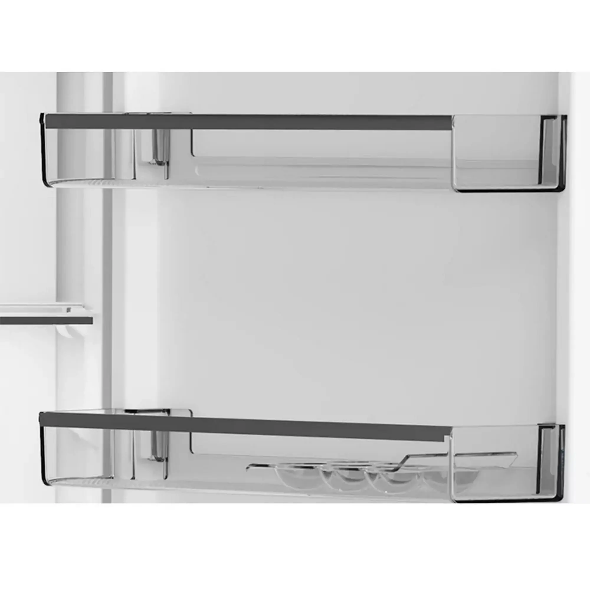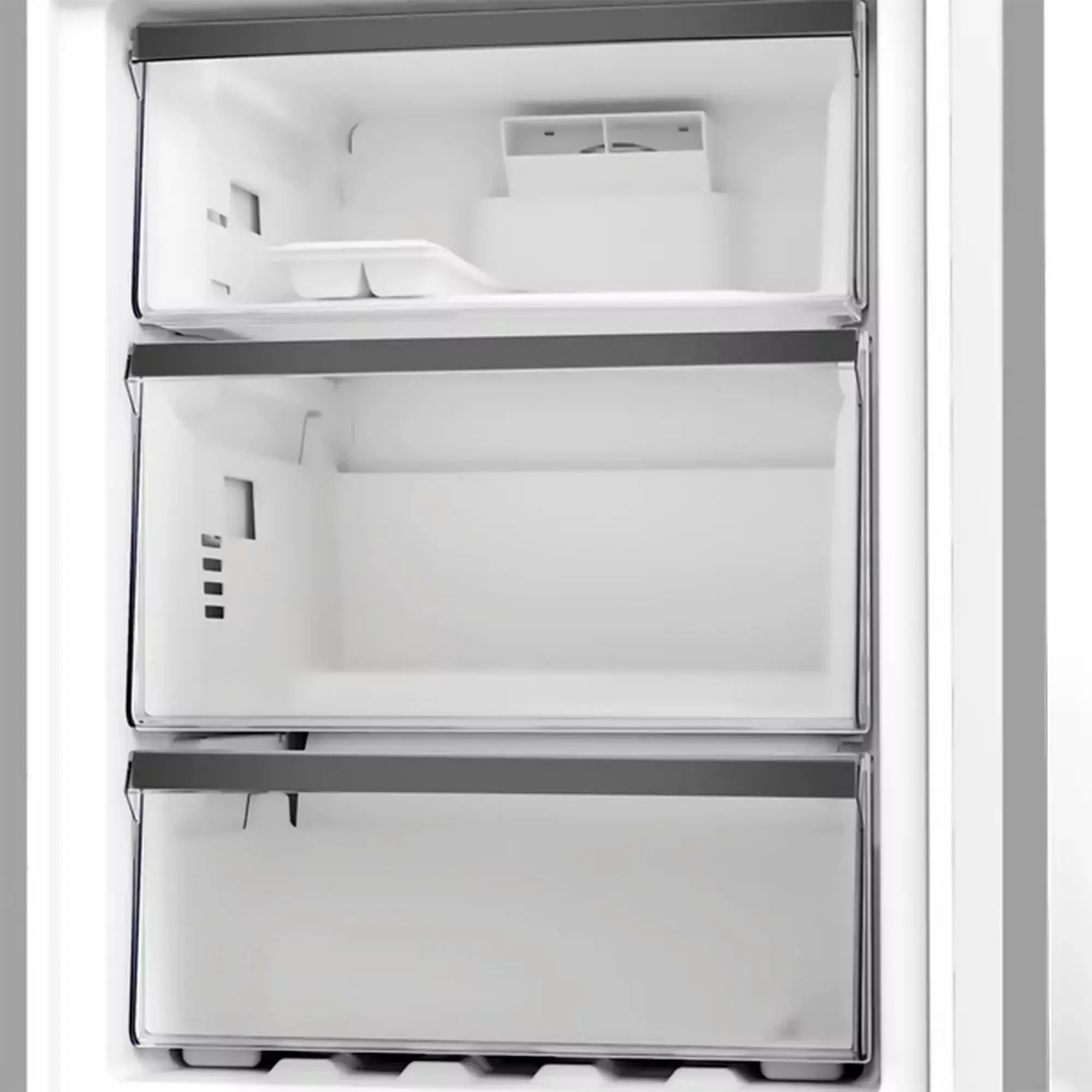 Сучасний двокамерний холодильник із загальним об'ємом 355 л і технологією повного No Frost забезпечує рівномірне охолодження без інею. Інверторний компресор гарантує енергоефективність (A++) та тиху роботу з рівнем шуму лише 35 дБ. Оснащений електронним керуванням, прихованими ручками, дисплеєм і зручними функціями, як-от «Еко режим» та «Режим відпустки». Об'ємна морозильна камера на 106 л підтримує автономне збереження холоду до 11 годин.