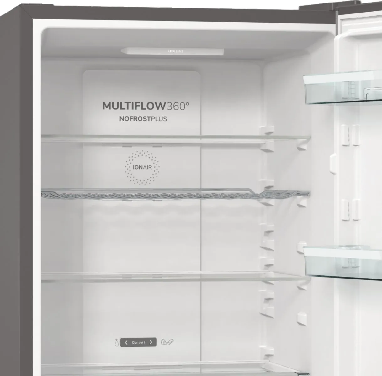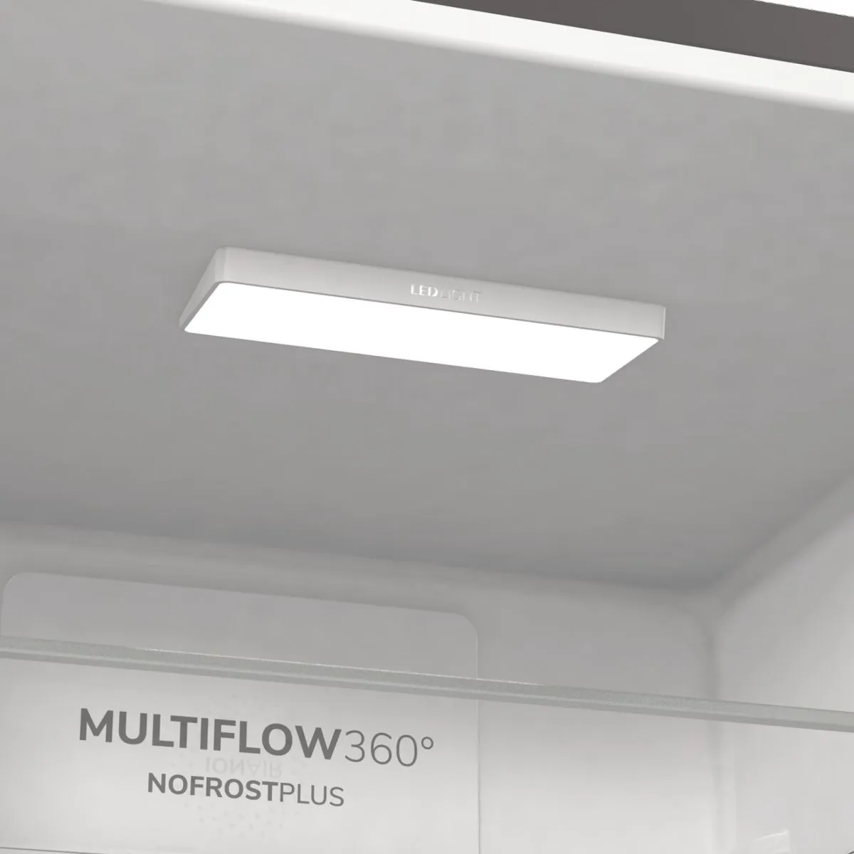 Одна з найкращих систем охолодження на ринку, встановлена в морозильній камері, запобігає накопиченню льоду та інею, що дозволяє знизити енергоспоживання. В результаті ємність сховища використовується оптимально, а розморожування та очищення внутрішньої частини більше не потрібні. Пакети або шматочки заморожених продуктів не прилипатимуть один до одного, завдяки чому продукти в морозильній камері залишаться чистими та акуратними. IonAir створює всередині приладу негативно заряджені іони, які завдяки системі MultiFlow 360 ° рівномірно розподіляються по всій холодильній камері. Збагачене цими аніонами повітря зберігає смак і усуває неприємні запахи.