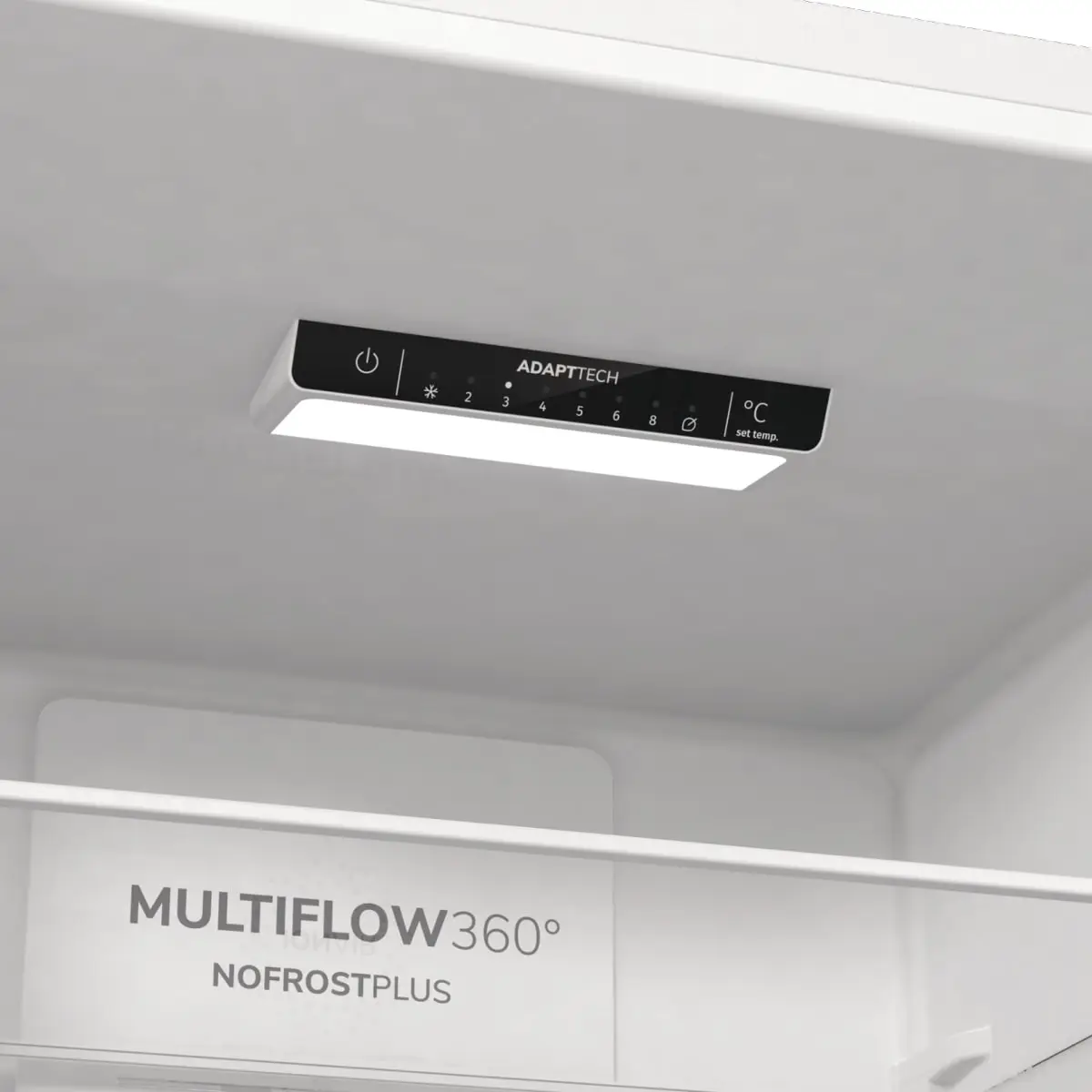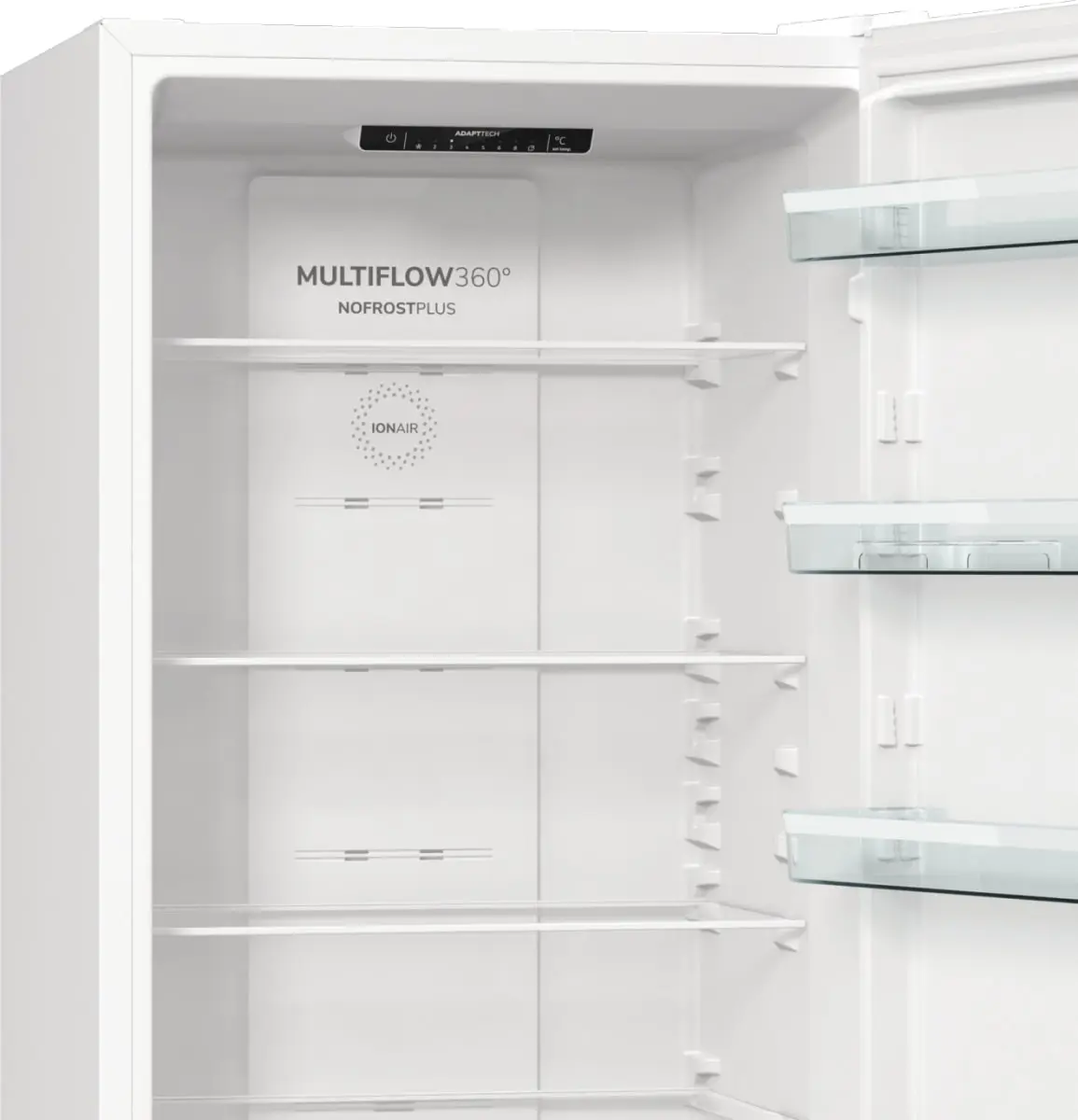 Холодильник Gorenje NRK6202EW4 - це двокамерний пристрій з загальним об’ємом 331 літр. Він оснащений технологією NoFrost Plus, яка запобігає утворенню льоду і спрощує догляд. Система IonAir з MultiFlow 360° забезпечує ідеальний мікроклімат на кожній полиці, зберігаючи свіжість продуктів. Завдяки функції AdaptTech, холодильник автоматично регулює температуру в залежності від частоти відкривання дверей. Крім того, він має низький рівень шуму - всього 38 дБ. Холодильник також оснащений великим ящиком для овочів і фруктів, що допомагає зберігати їх свіжими довше.