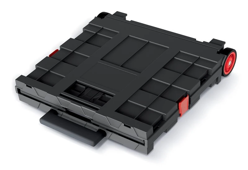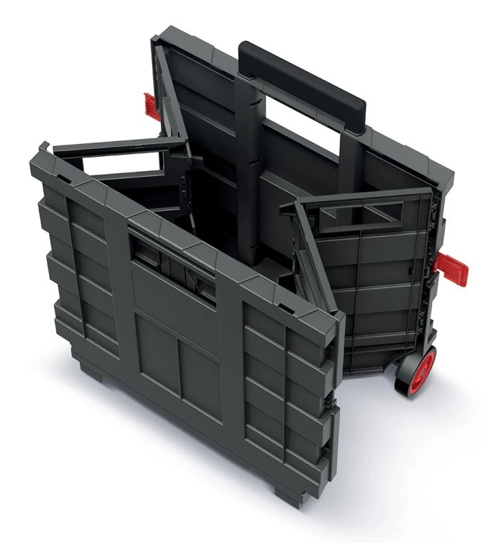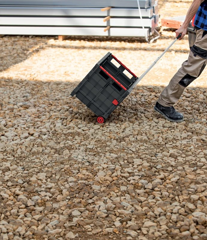 Зручний і компактний складний ящик для інструментів з телескопічною алюмінієвою ручкою. Оснащений колесами з еластомірним покриттям для легкого транспортування. Вантажопідйомність до 25 кг.