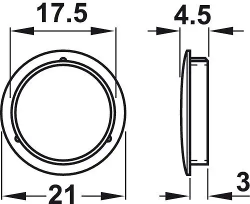 Заглушка виготовлена з цинкового сплаву цамак з нікельованою поверхнею. Розміри заглушки (мм): діаметр голівки товщина голівки діаметр ніжки висота ніжки - 21 1,5 17,5 3 мм.