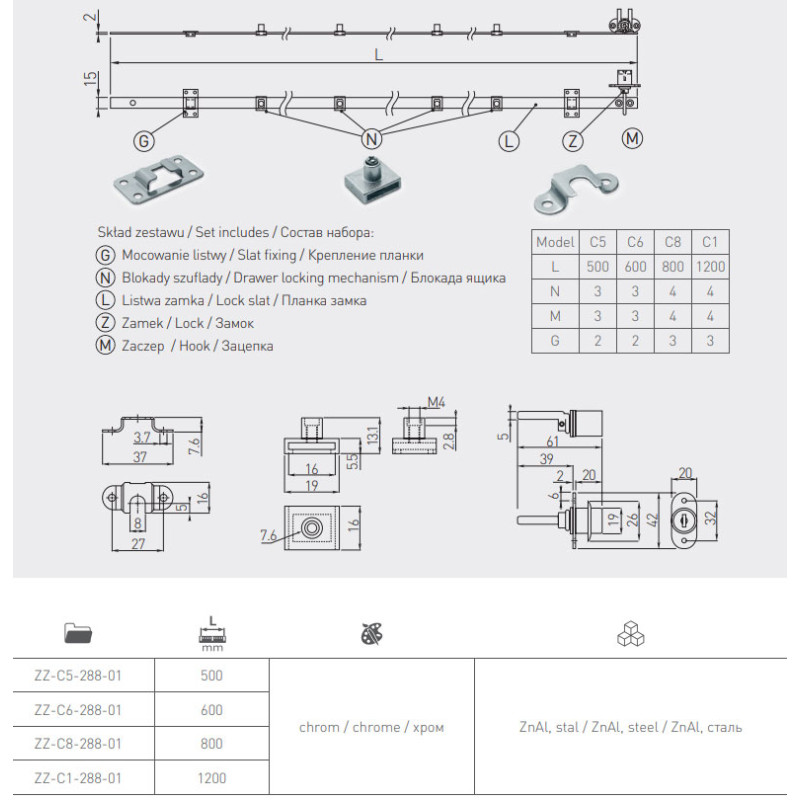 Замок оснащён системой тяг длиной 288×500 мм, обеспечивающей одновременное запирание нескольких выдвижных секций. Для корректной работы рекомендуется точное выравнивание корпуса и тяг. В комплект входят ключи и крепёжные элементы.