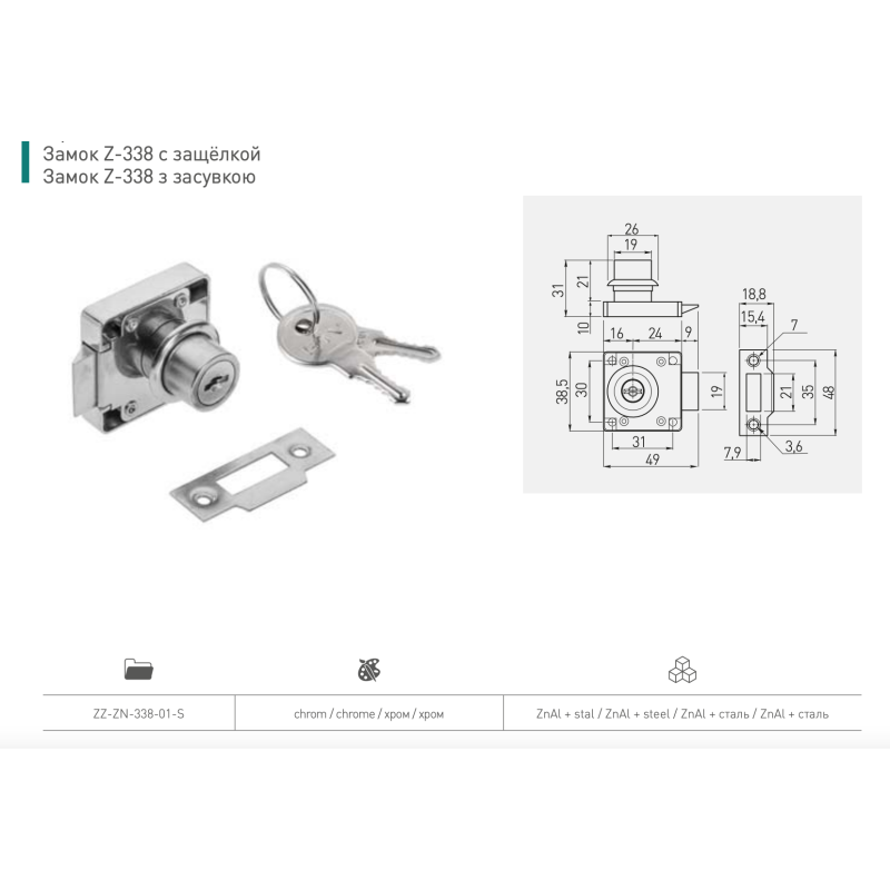 Модель ZZ-ZN-338-01 применяется в мебельных шкафах, тумбах, витринах, металлических и деревянных дверцах. Замок с фиксатором удобен для офисной, бытовой, хозяйственной и торговой мебели, где требуется надёжная фиксация без использования отдельного ключа. Отлично подходит для внутренних перегородок и технических отсеков.