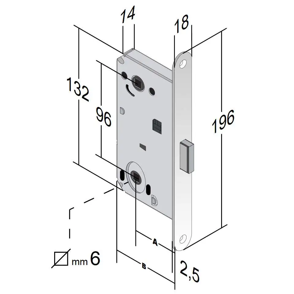 Розмір під чотиригранний штифт дверних ручок: 8 х 6 мм. Розмір під чотиригранний штифт нижньої блокування: 8 х 6 мм. Ширина лицьової планки магнітного замка: 18 мм. Висота лицьової планки магнітного замка: 196 мм.