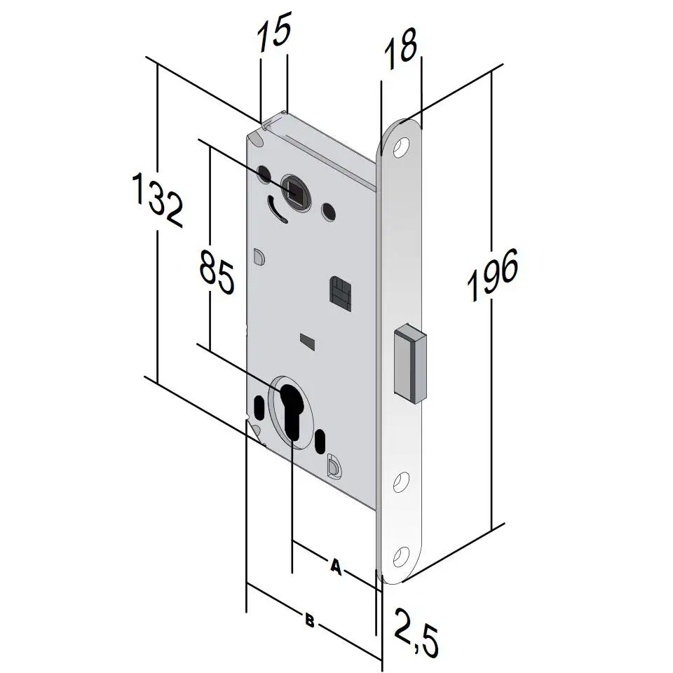 Лицьова планка врізного замка закруглена. Замок врізний, матеріал: Лицьова планка: сталь, хромована матова. Ригель з пластмаси забезпечує безшумне закриття дверей, без металевого дзвону. Розмір під чотиригранний штифт дверних ручок: 8/6 мм. Ширина лицьової планки врізного замка: 18 мм. Висота лицьової планки врізного замка: 196 мм. Глибина врізки замка: 75 мм. Ригель замка: для закриття і відкриття замка потрібно один оберт. Монтаж шляхом врізання.