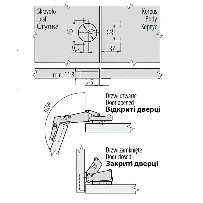 - Угол открывания: 165° для широкого доступа к внутреннему пространству мебели.