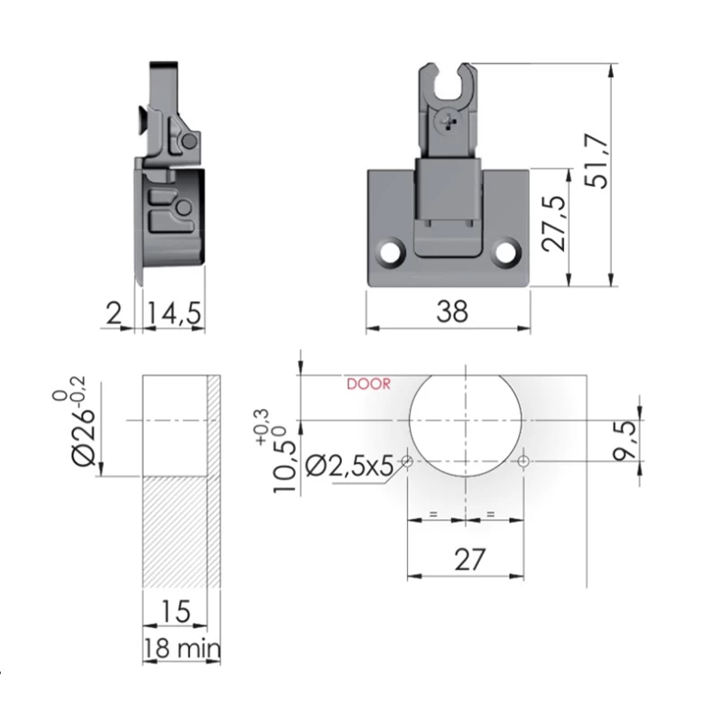 - Диаметр монтажных отверстий: 26 мм (для дверей и основания шкафа)