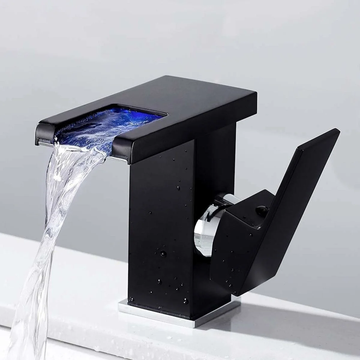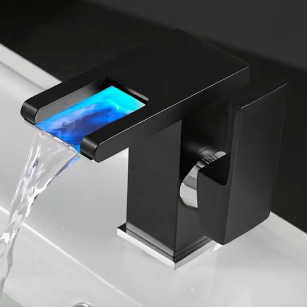 Дизайнерський змішувач-водоспад з нержавіючої сталі не тільки вражає своїм сучасним виглядом, а й забезпечує зручне та безпечне користування завдяки триколірному LED-підсвічуванню, яке змінюється відповідно до температури води: