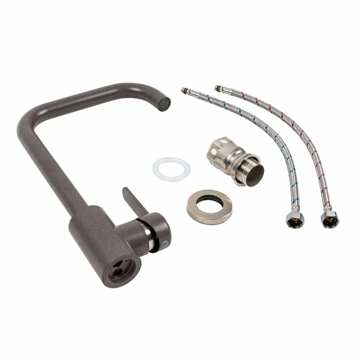 Два шланги довжиною 50 см дозволяють зручно приєднати змішувач до водопроводу. Комплектація включає кріплення для змішувача та прокладки (2 шт), що спрощує монтаж та забезпечує надійну фіксацію.