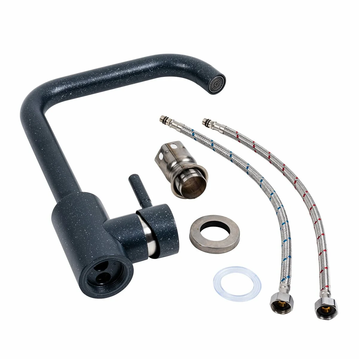 Змішувач кухонний Platinum NS02B (3008B-NA) Антрацит це вишуканий та функціональний аксесуар для вашої кухні, призначений для забезпечення комфорту та ефективності під час готування та миття посуду. Ось більше інформації про цей змішувач: