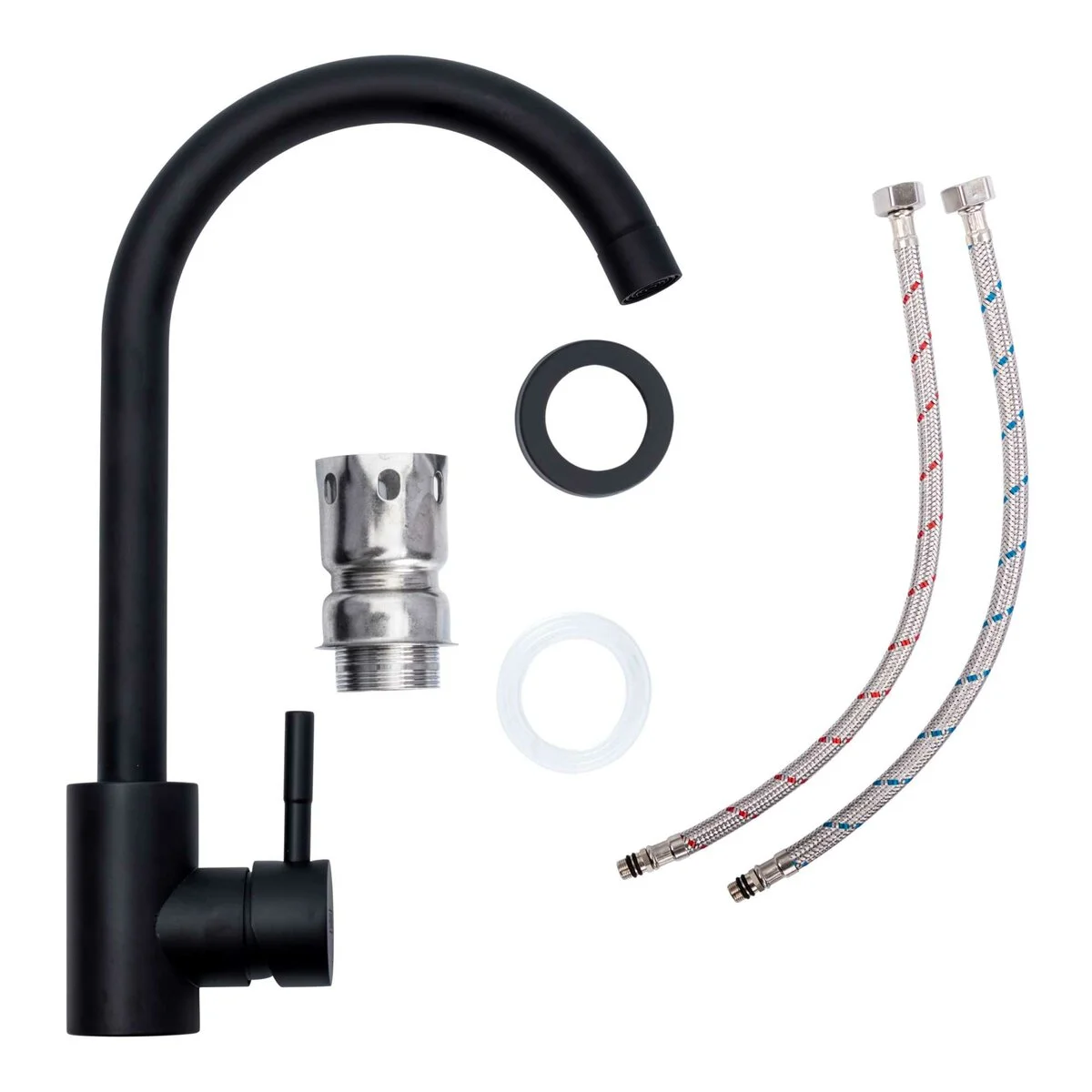 Довжина виливу складає 145 мм, що дозволяє зручно направляти потік води. У комплекті зі змішувачем йдуть два шланги завдовжки 50 см, які забезпечують надійний зв'язок з водопроводом. Крім того, ви знайдете всі необхідні комплектуючі, такі як кріплення, прокладка і гайки, для легкої та надійної установки змішувача.